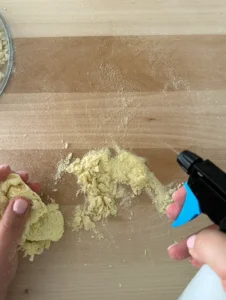 - Come back to the crumbly dough and start to bring it together with your hands, squeezing and coaxing it in a ball of dough that’s knead-able – scraping up and incorporating as much loose flour from your work surface as possible. You’ll likely need to use the aid of a spritz bottle of water – spray the work surface as opposed to the dough, and use it to help you form a ball.