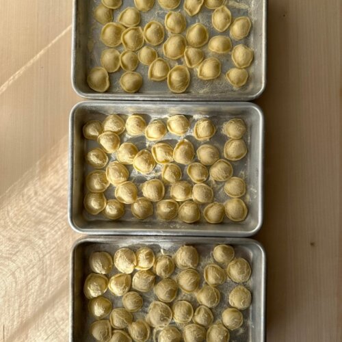 As mentioned above, the most typical ratio suggested for durum wheat semolina flour doughs is 50%. This is the type of dough you’d make for many hand formed shapes like orecchiette, cavatelli, lorighittas, trofie, the like. More often than not, I suggest a 50% hydration dough in my recipes because it can be applied to practically every shape, and frankly it’s a lot easier to work with.