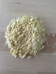 - Switch to a bench scraper and start to flip the flour from the outer edge over and onto the water mix, using a cutting motion to then mix it in. Continue to do this around all sides until you have a crumbly, sand-like mix. It’s ok if you have some loose flour, but try to incorporate at much as possible.