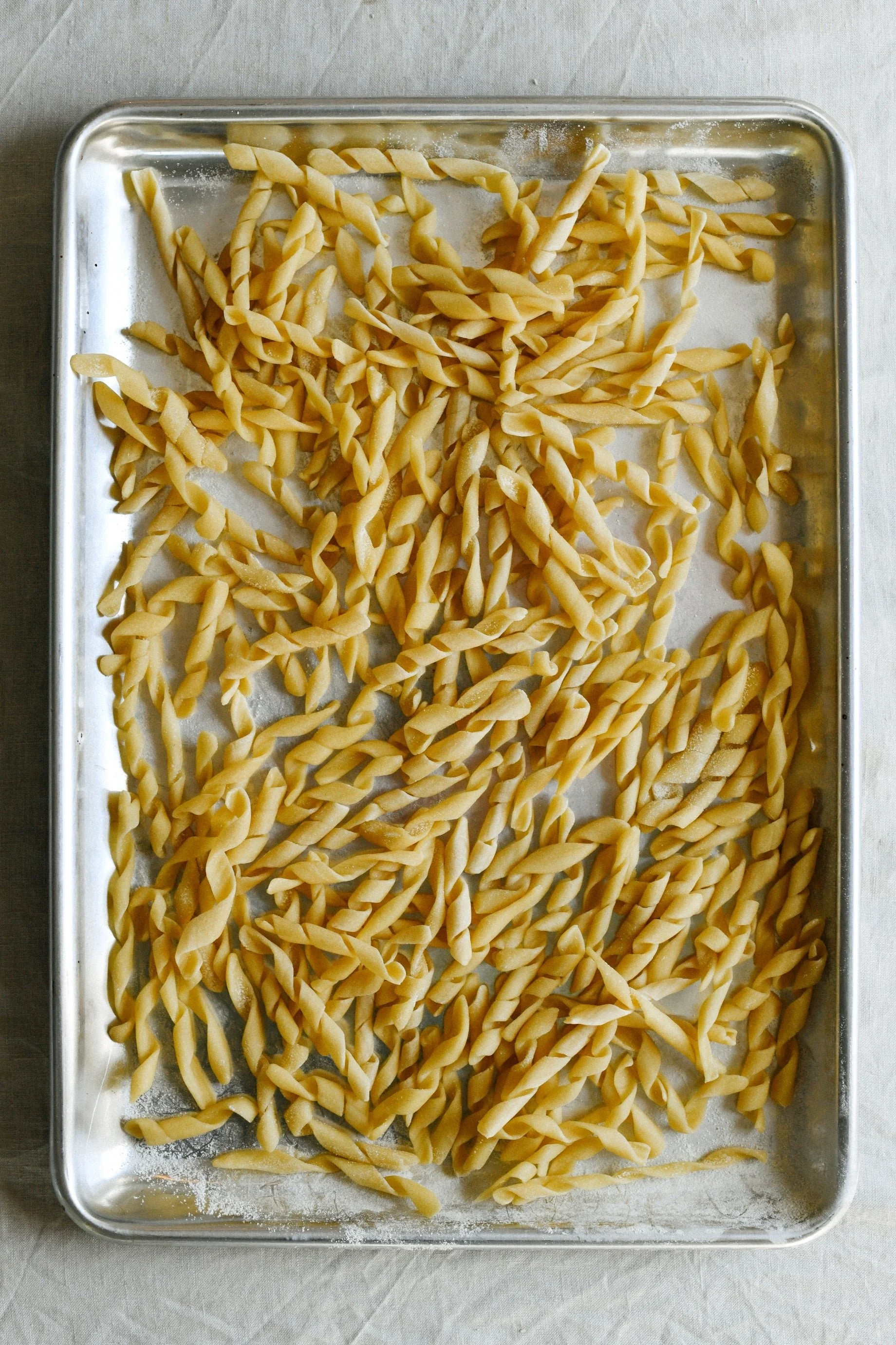 Continue until youβve used all the dough, placing the busiate pieces on a tray dusted with fine semolina.