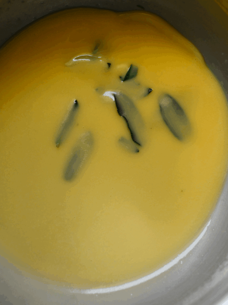 - Continue adding the rest of the butter, whisking, whirling and swirling – throw in your herbs of choice (sage, thyme etc).