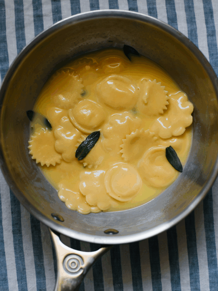 - NB: if you aren’t planning on cooking the ravioli right away or if you have leftovers, I always recommended freezing them until you’re ready to use to prevent the base of the ravioli from getting soggy. Place the ravioli on a tray in a single layer and flash freeze for 20 minutes. Then place in an airtight container and store in the freezer until you’re ready to use. Cook directly from frozen (they might take 30 seconds-1 minute longer to cook so be mindful).