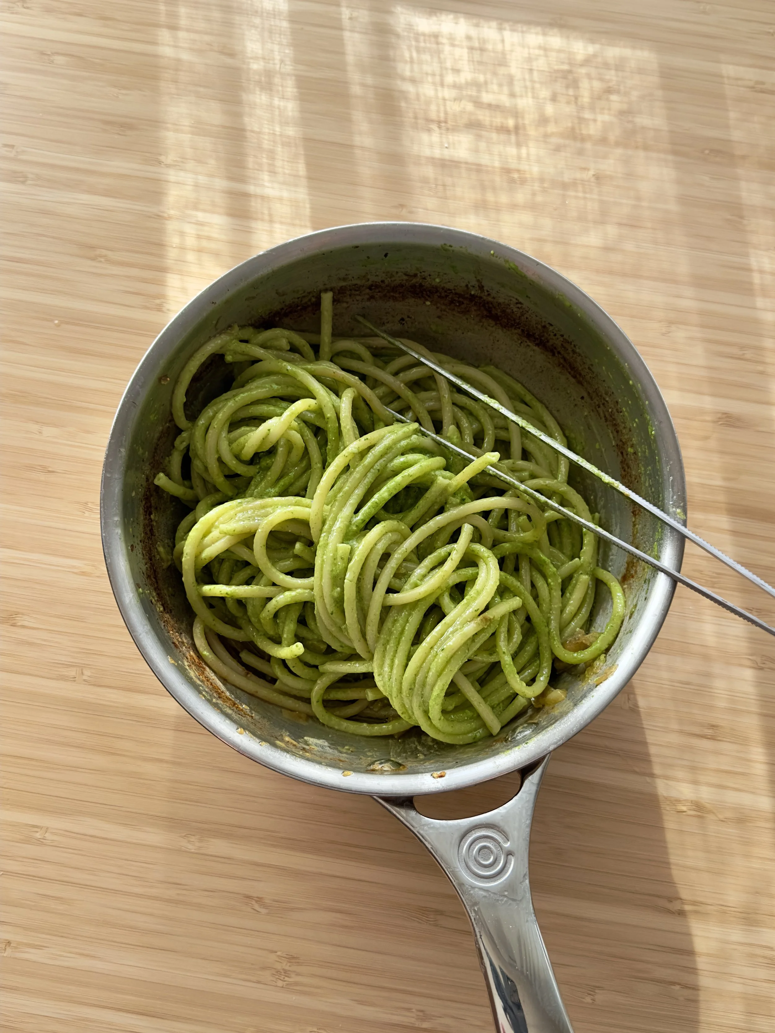 Remove from the heat and add al dente pasta and the pesto to the butter lemon sauce, then vigorously toss to combine.