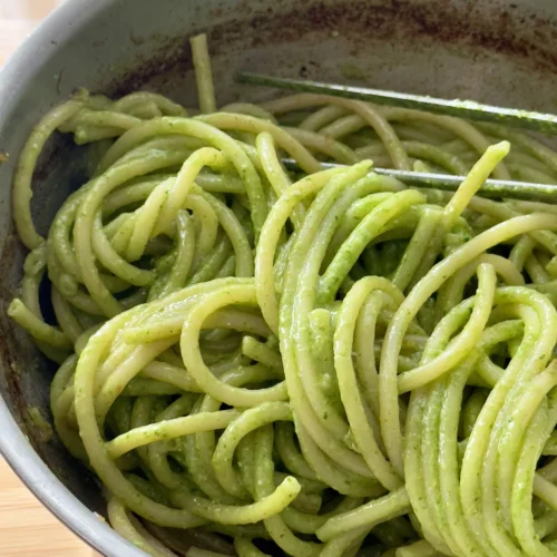 Comes together in minutes – especially if you make the pesto in a blender – this is truly a 15 minute meal.