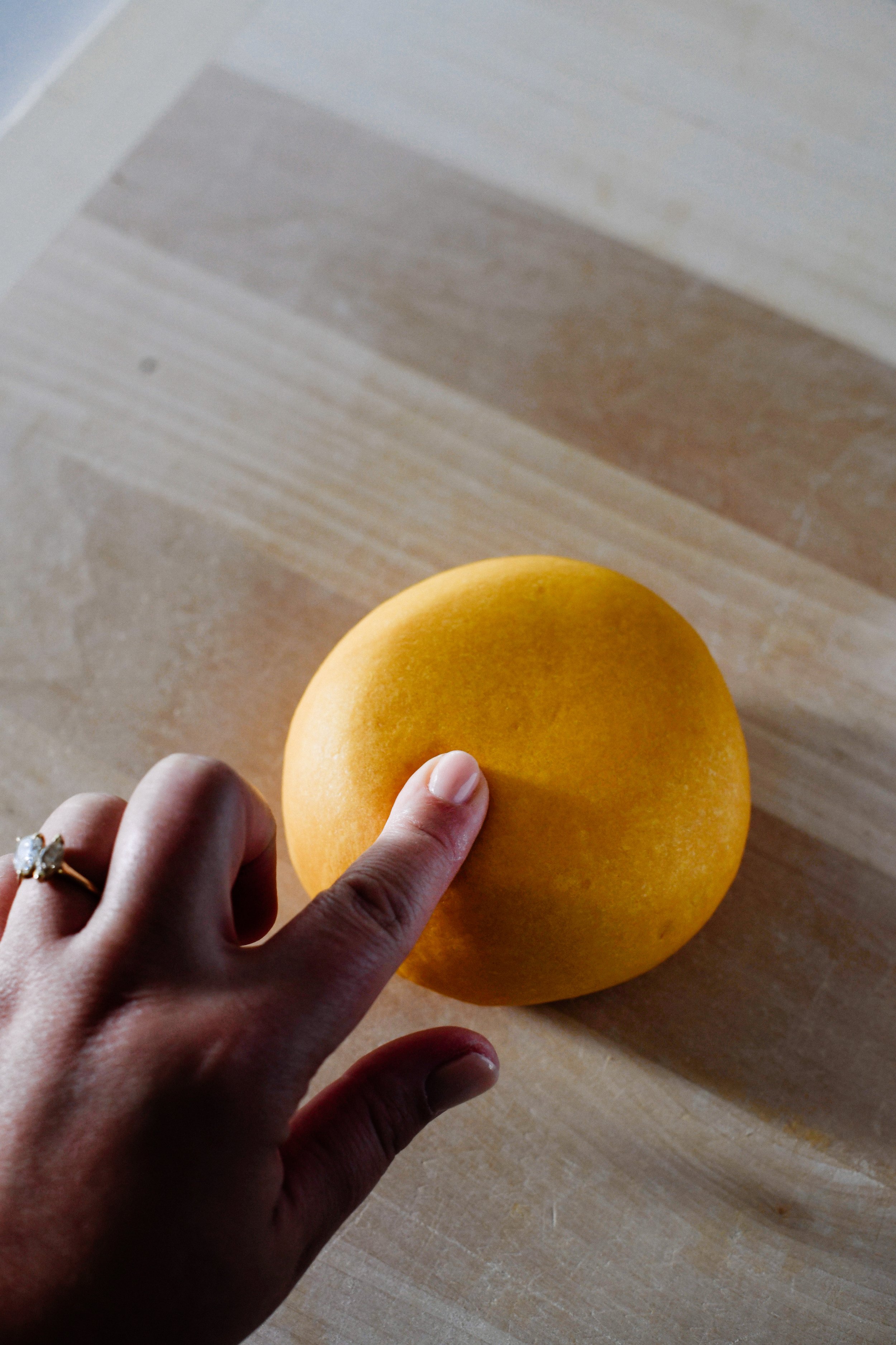 Note: this yolk dough is 93% hydrated which makes it a little easier to work with. If however, you find it is very dry, wet your hands and return to the dough and continue kneading.