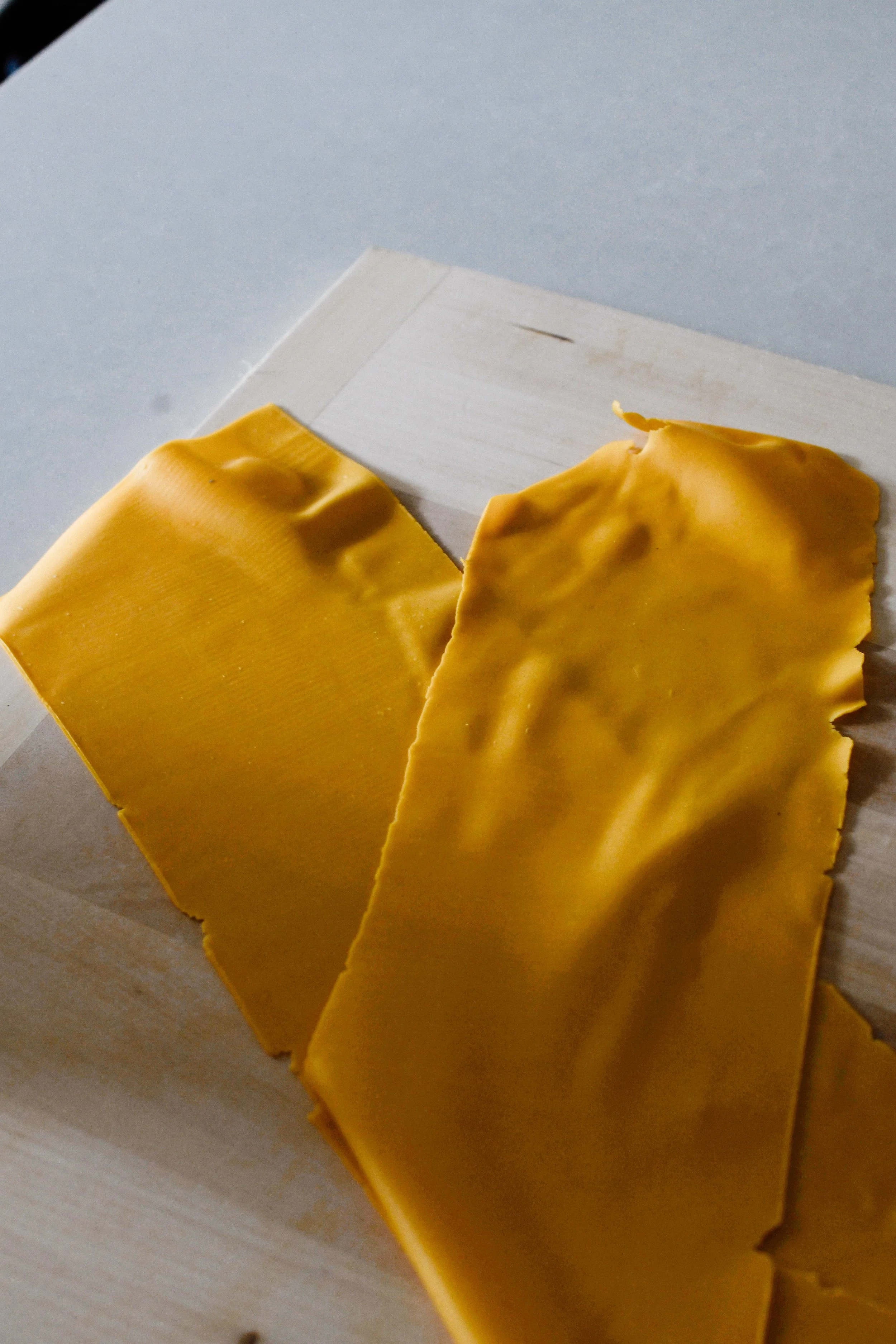 1. Divide the dough into four pieces. Work with one at a time – flatten the piece with your hand or a rolling pin before passing it through the thickest setting on your pasta machine. Fold the edges in to create a neat rectangle that fits the width of your pasta machine, and run it through the thickest setting again until your dough is uniform in shape