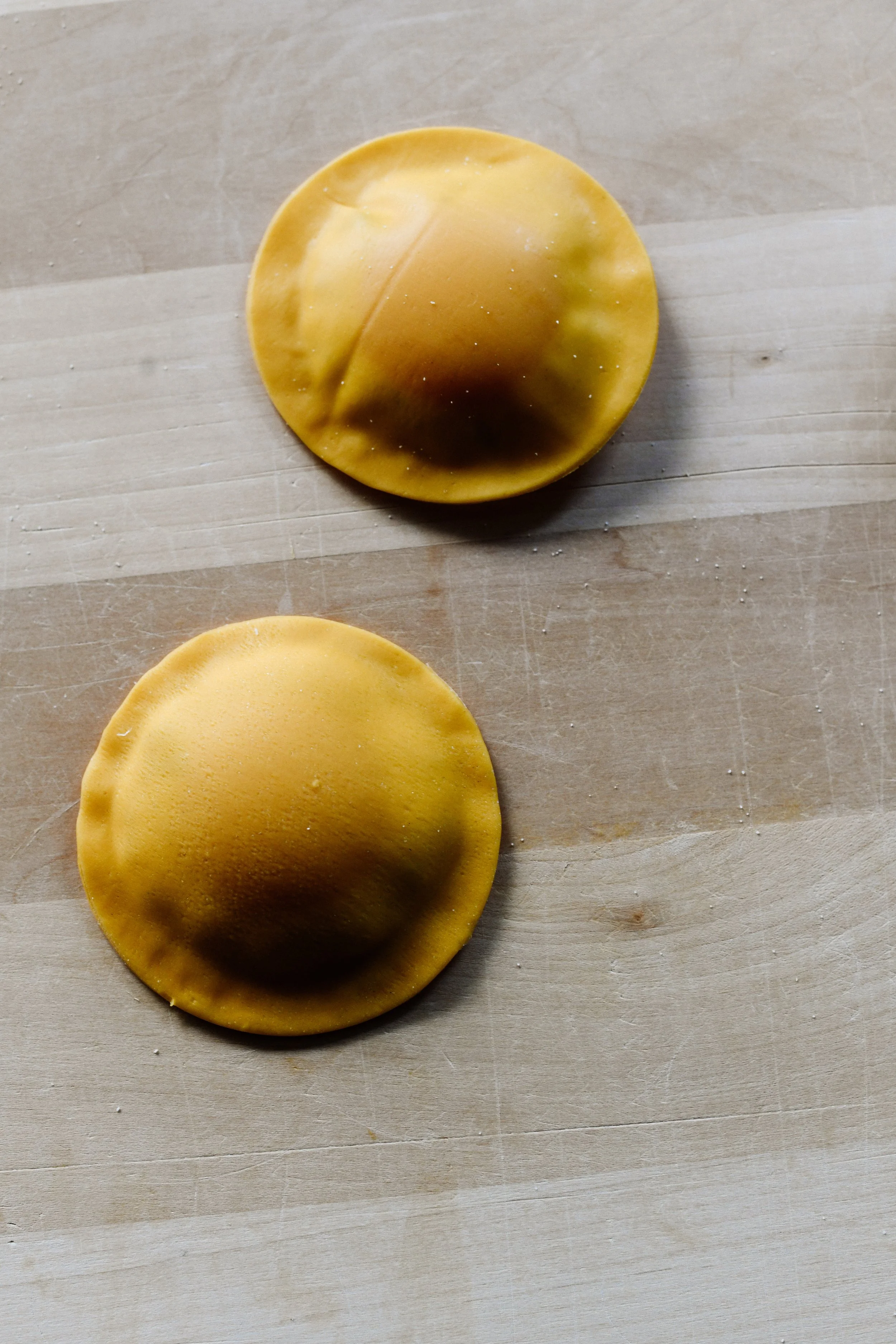7. Use the dull edge of a cookie cutter to gently work around the filling in a circular motion to ensure any extra air is removed, then cut the edges of the raviolo either with a knife (if you want a square shape), or a circular cutter like I’ve done here.
