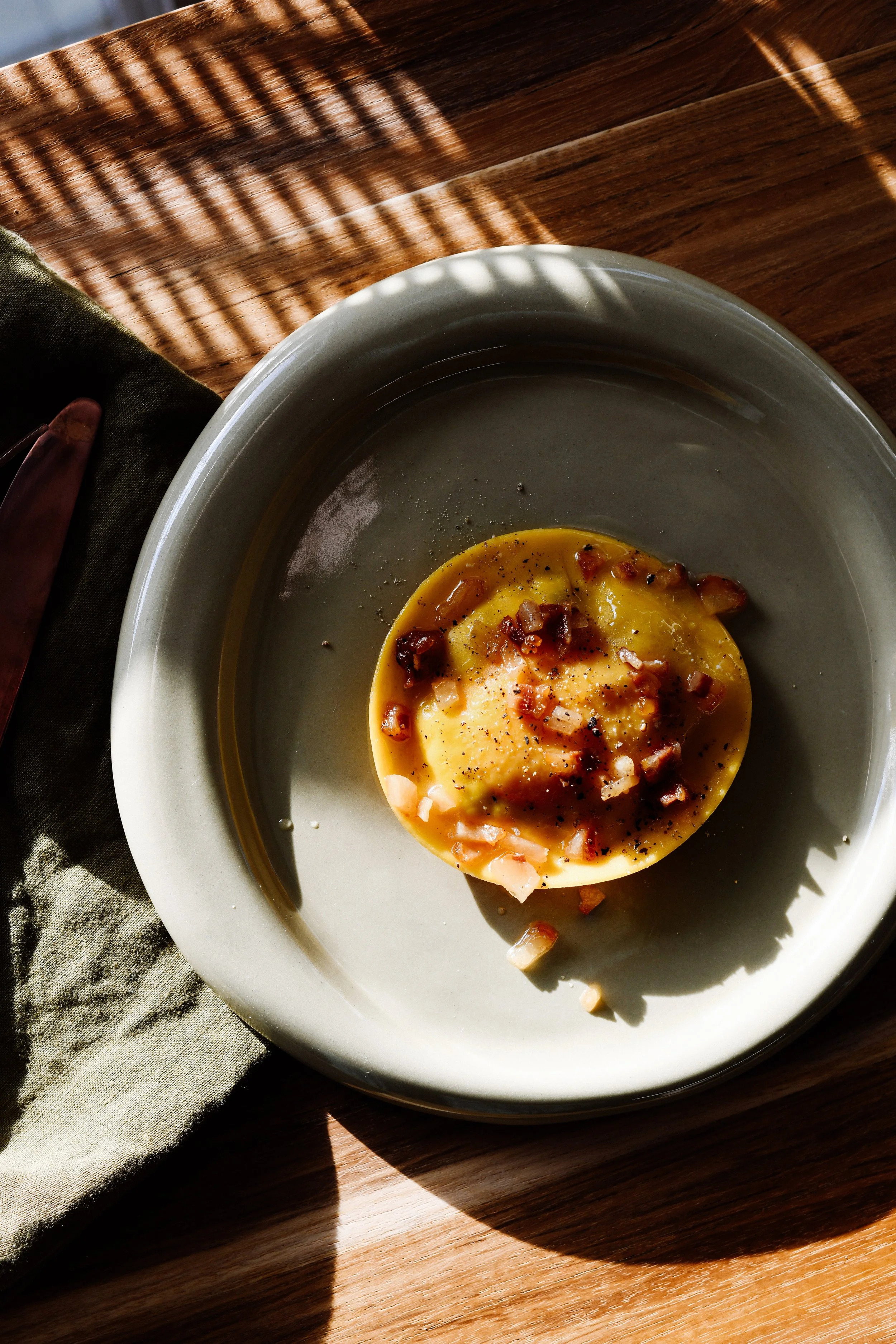 5. Be mindful not to toss or whirl the pan here as we want the egg yolks to remain intact. Gently spoon over some of the guanciale and its fat over each raviolo momentarily and serve immediately (1 or 2 per person).