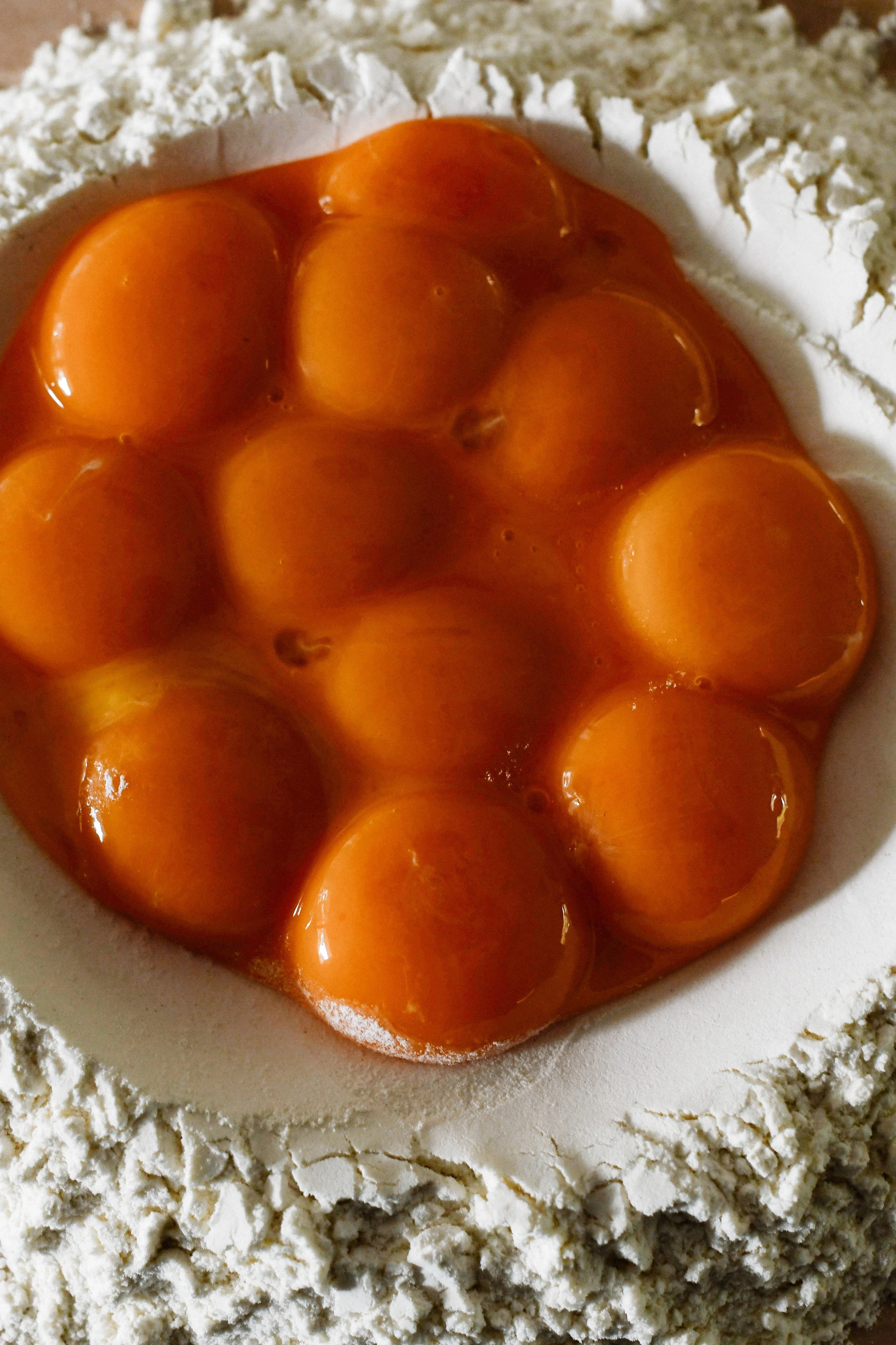 4. Gently place an egg yolk in the centre of the filling, then place another section of the pasta sheet over the top.