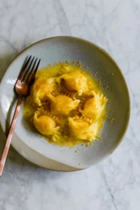 8. Very carefully place the raviolo on a baking sheet dusted with fine semolina. Continue with the rest of your dough, re-rolling any scraps of pasta from the previous raviolo.