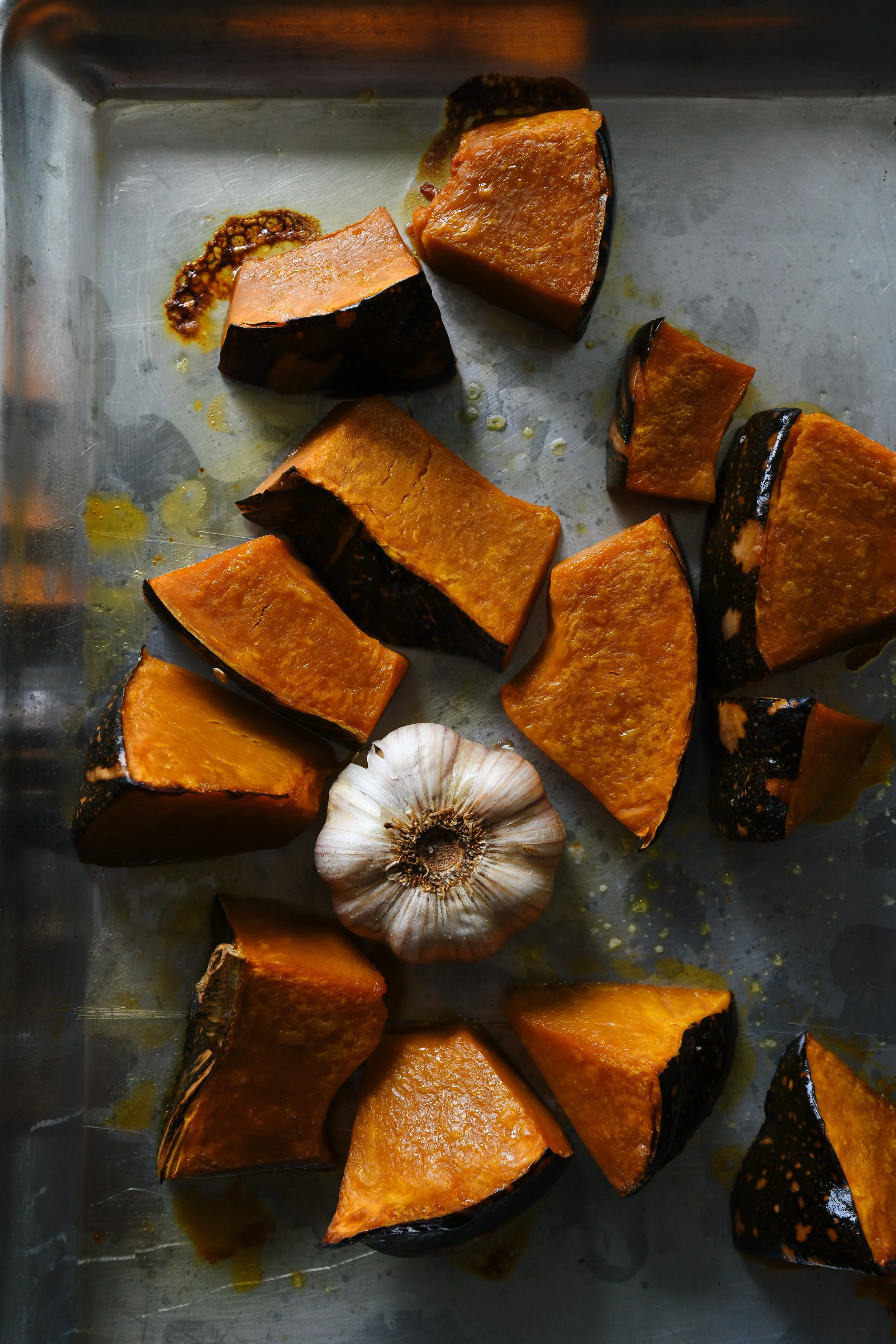 - Cut the pumpkin into large chunks and set out on a baking sheet. Cut the top off of a head of garlic and drizzle with olive oil – then place cut side down on the baking sheet.