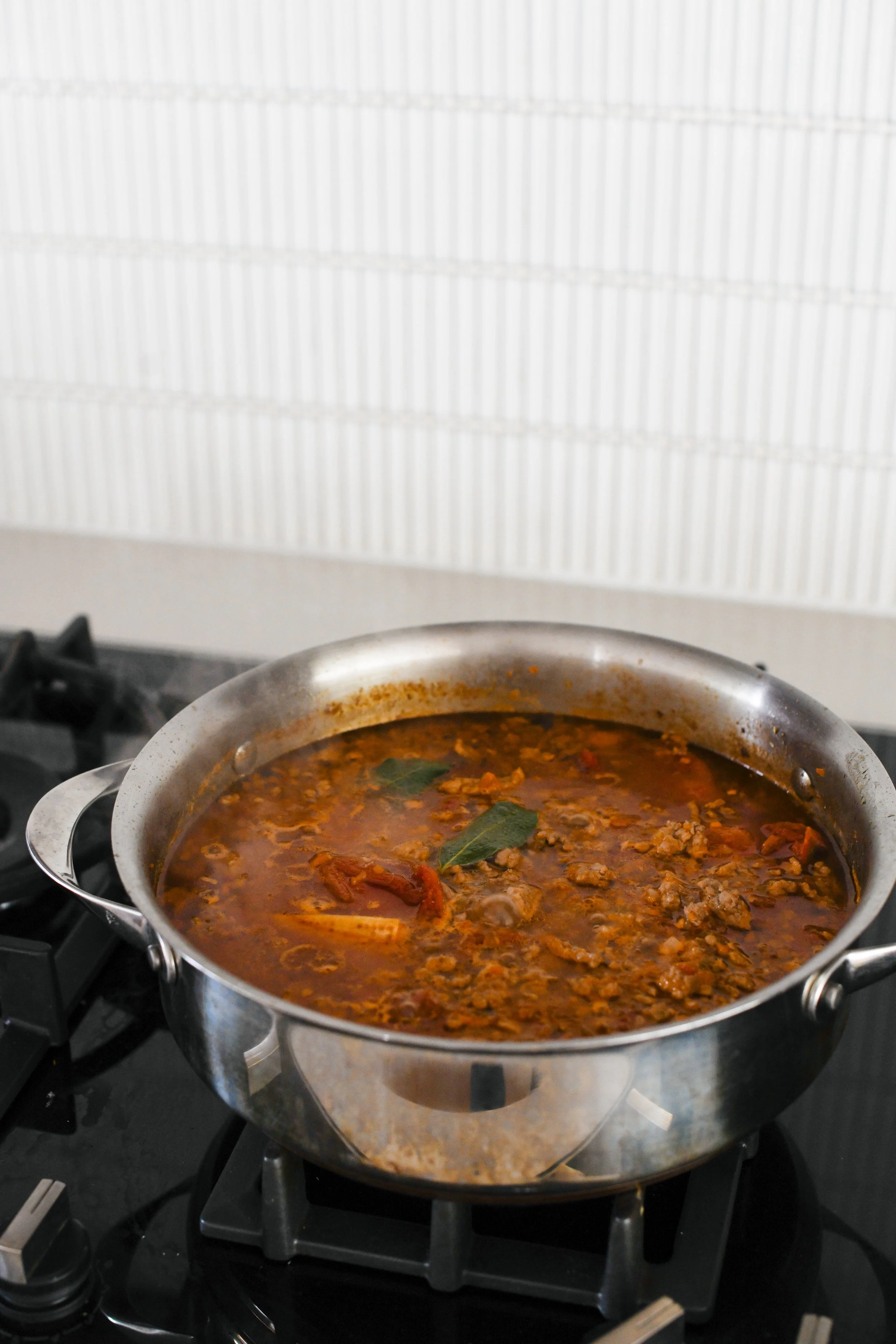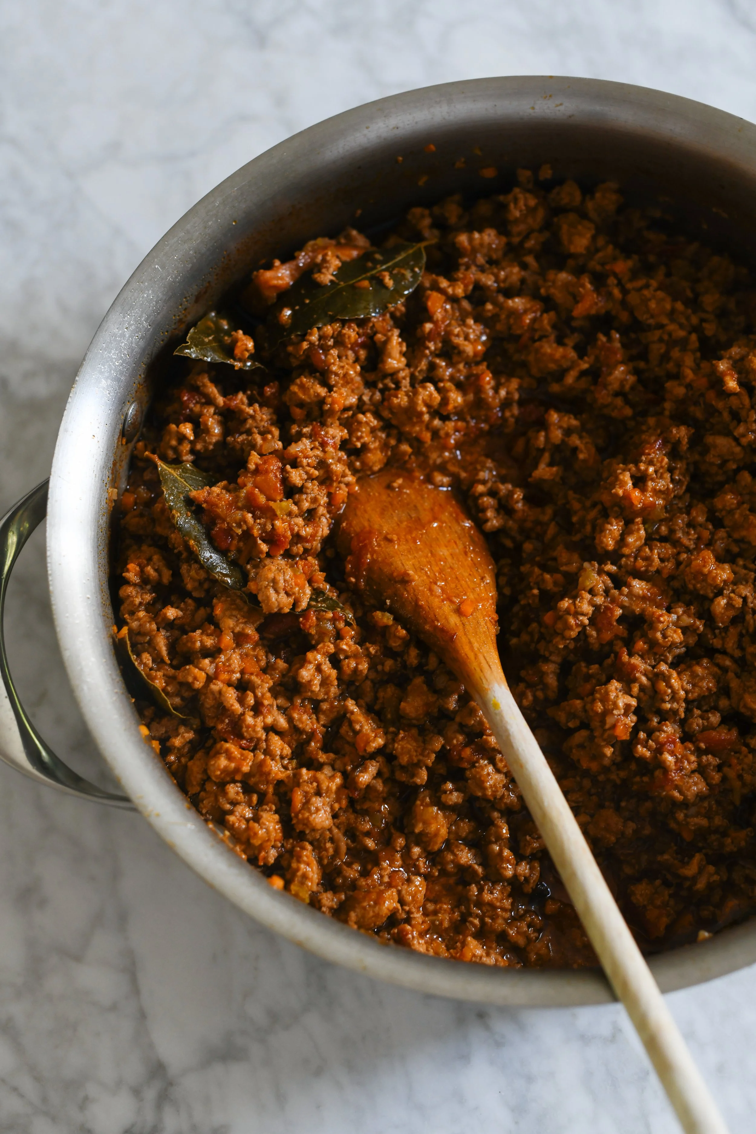- Bring to a boil, then cover and simmer for around 2-3 hours, stirring occasionally, until the liquid has reduced and you’re left with a luscious ragu. If you find your ragu is drying out, add a splash of water/beef stock as needed. You don’t want this to be crumbly and dry, it should still be moist and have nice movement in the pan.