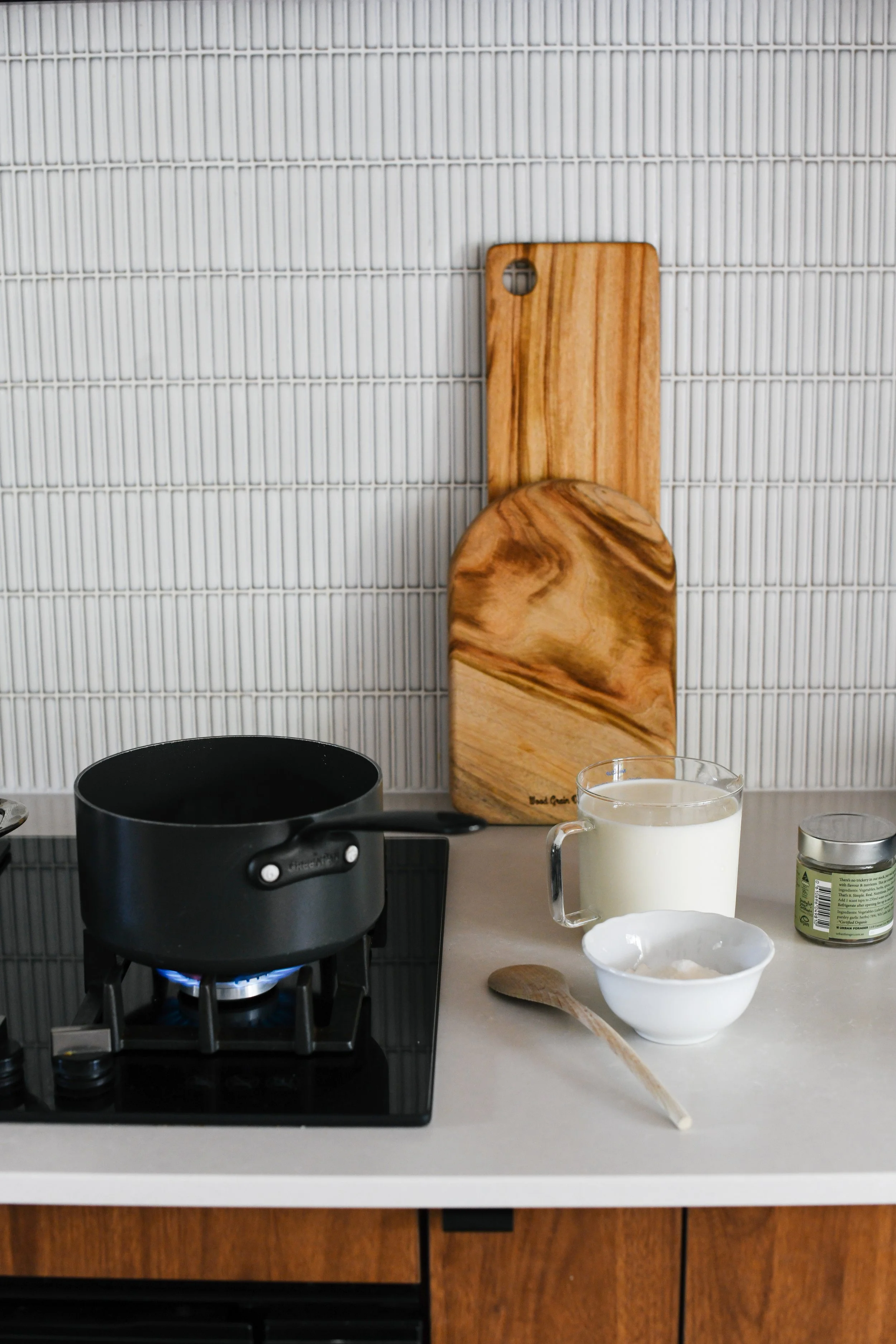 - Add the milk – I do this cold – whisking continuously until it’s combined with the roux, then over a gentle heat allow this to cook and thicken, stirring often (this is important).