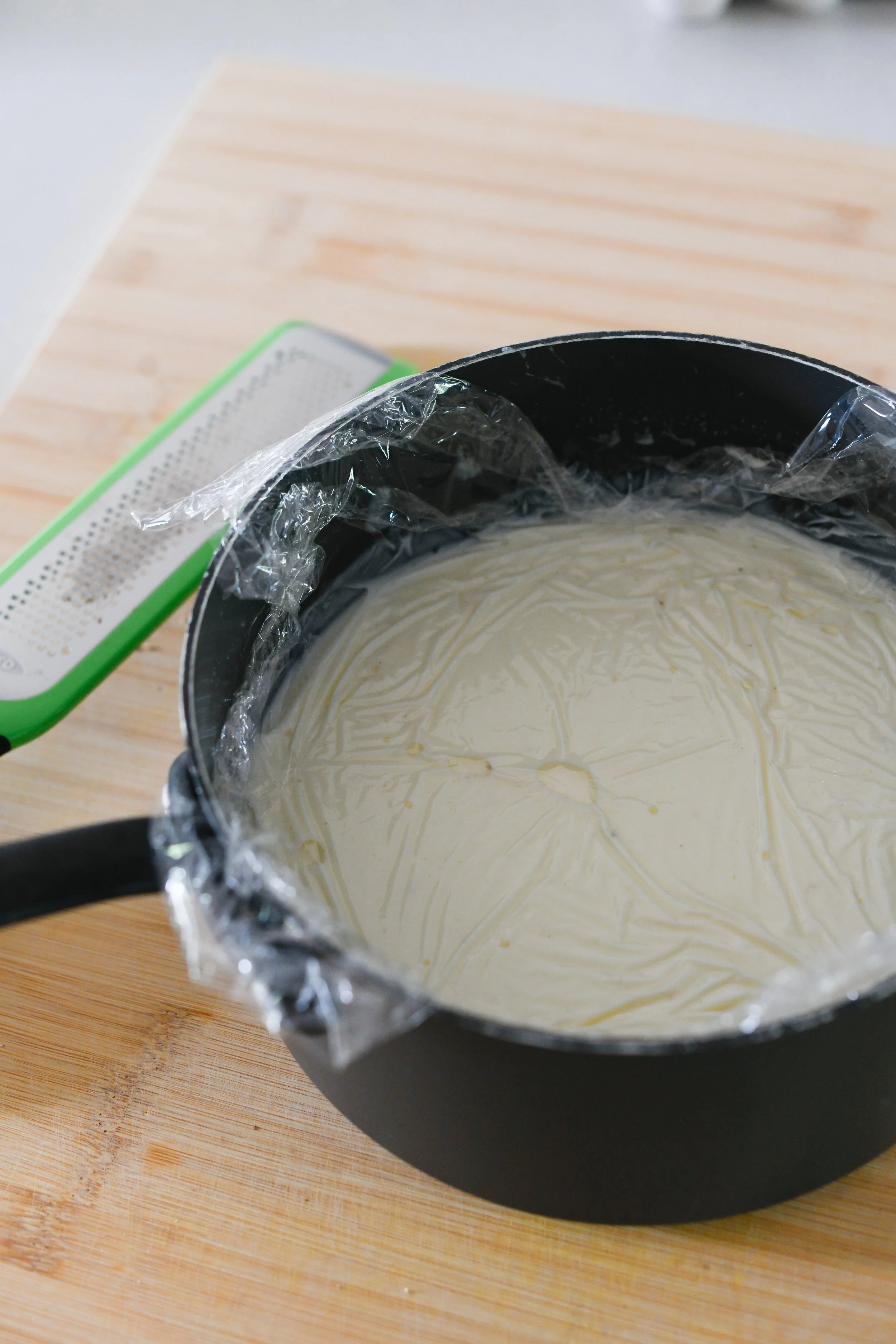 - Set aside and make sure you keep this covered to prevent a skin forming on the besciamella as it cools slightly – I press a piece of clingfilm directly onto the surface until assembly.