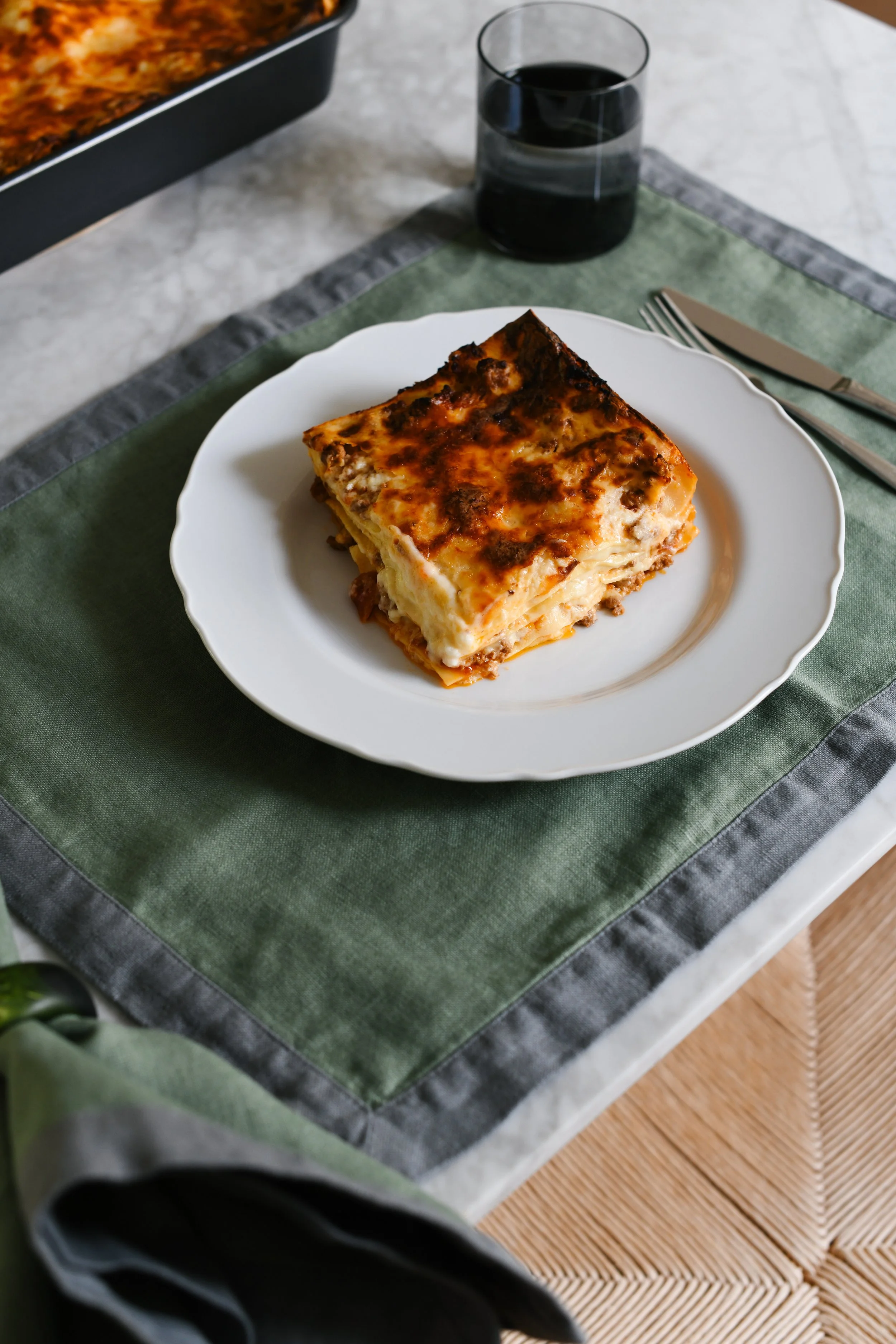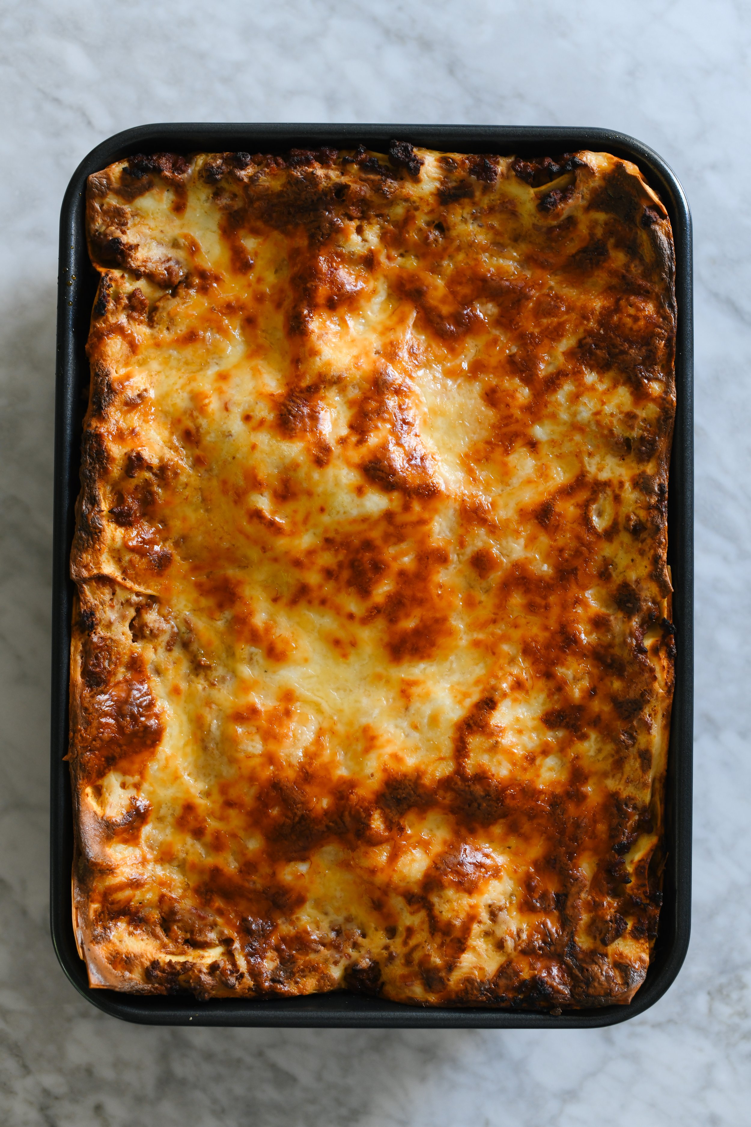 I have settled on this recipe as my go-to for a classic lasagne. It does not involve a proper, traditional bolognese ragu but rather, a classic veal/pork ragu that relies on slightly fewer ingredients and can be cooked in a little less time if you’re in a pinch. Basically, everything can be bought from your supermarket – no special deli for mortadella and other such things required.