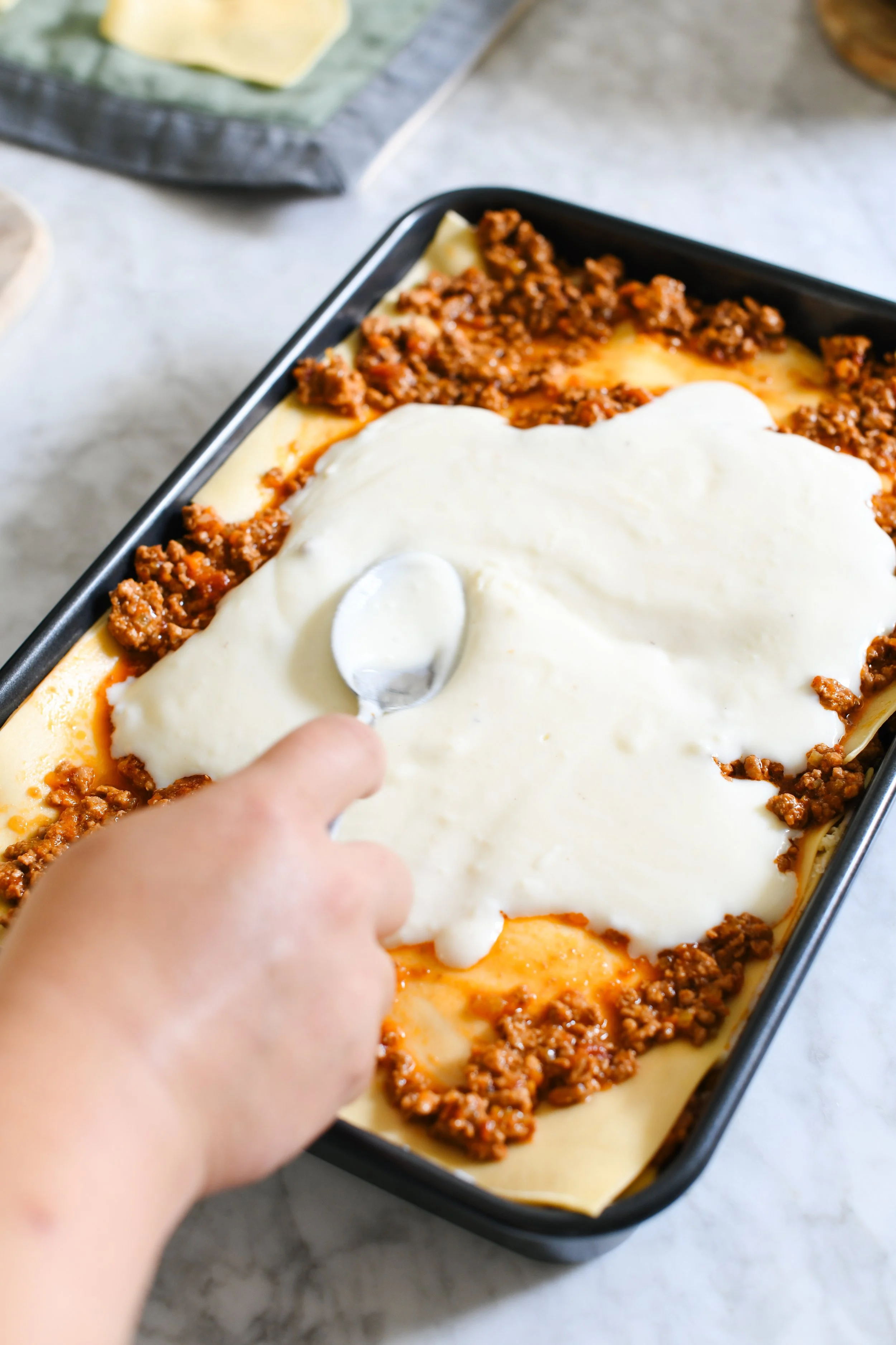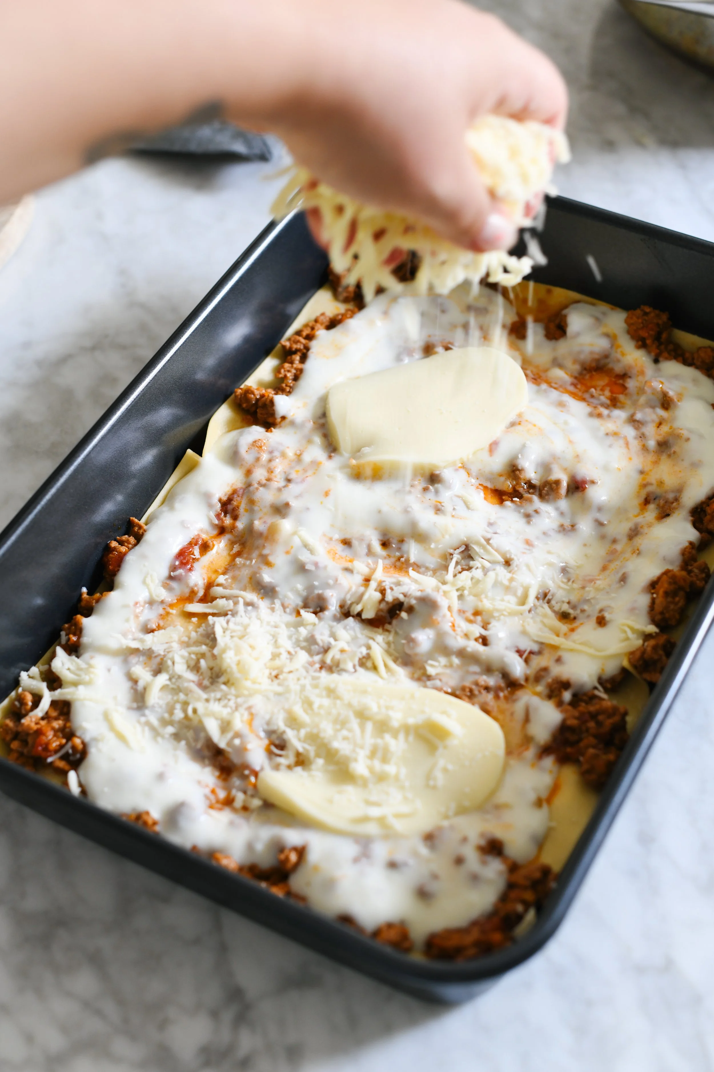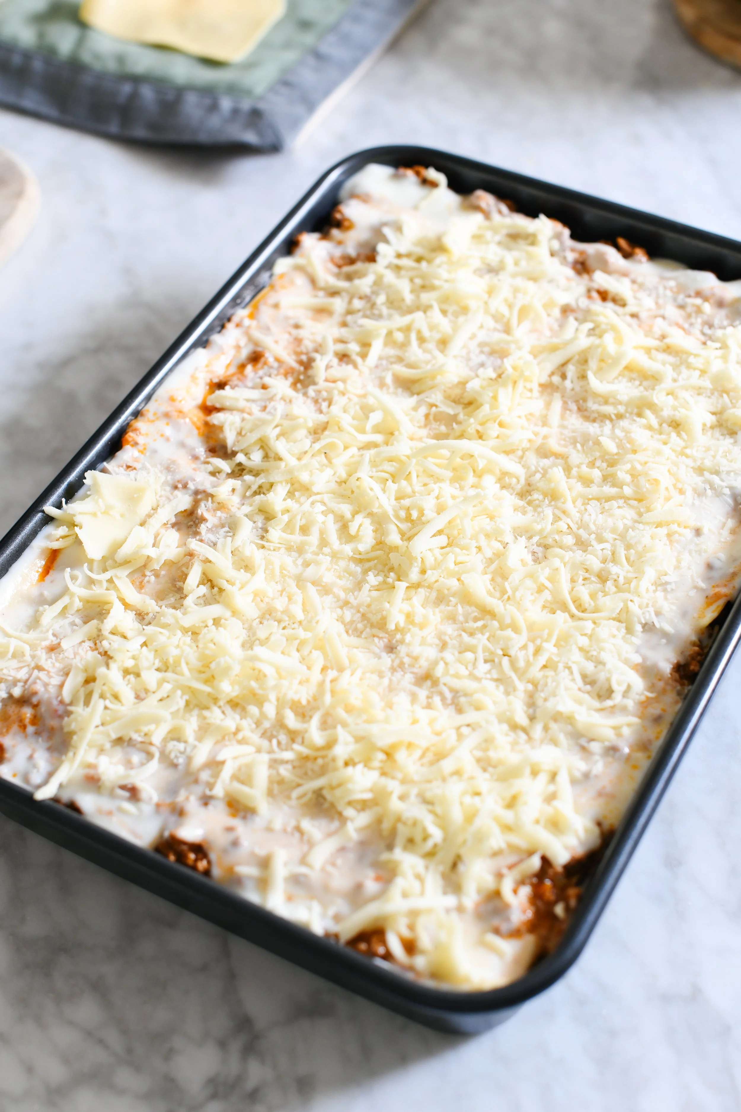 - Use what’s left of your ragu followed by a generous amount of besciamella (reserve some for this final layer!) – you want the pasta sheet fully covered. Cover with a whole heap of the cheeses.