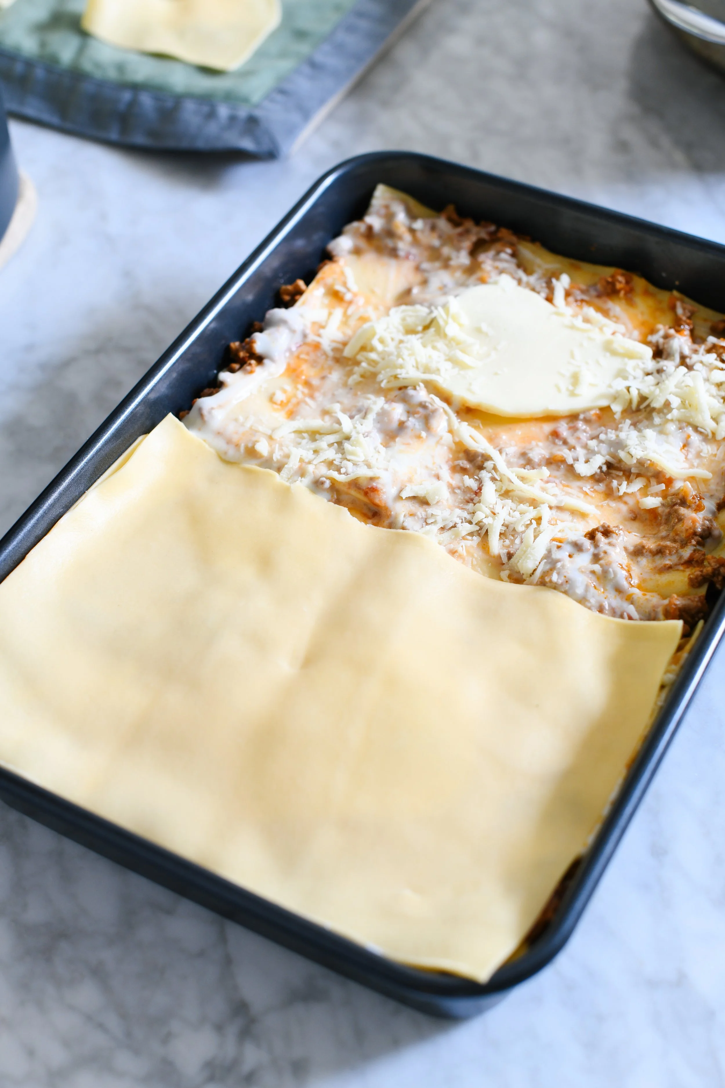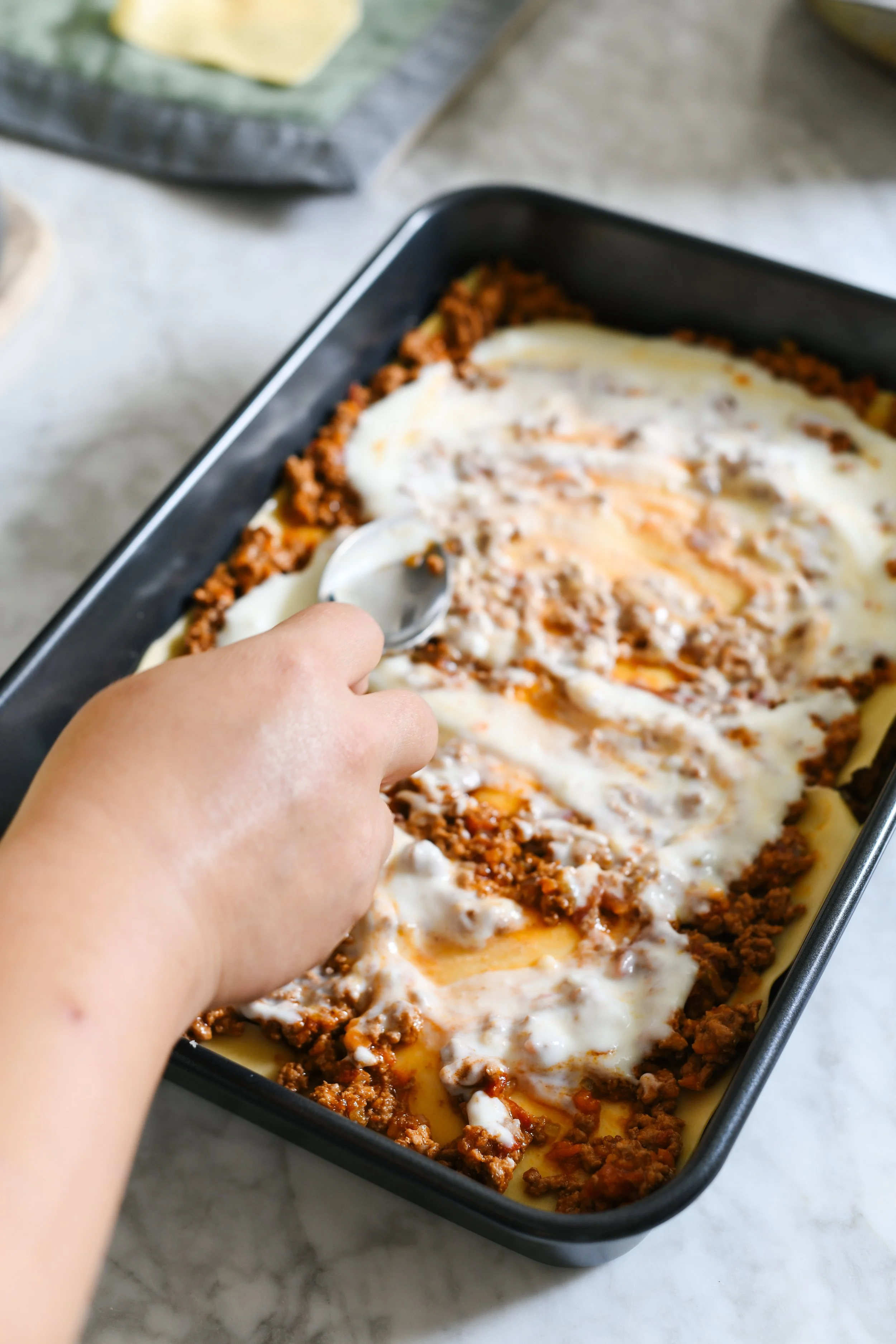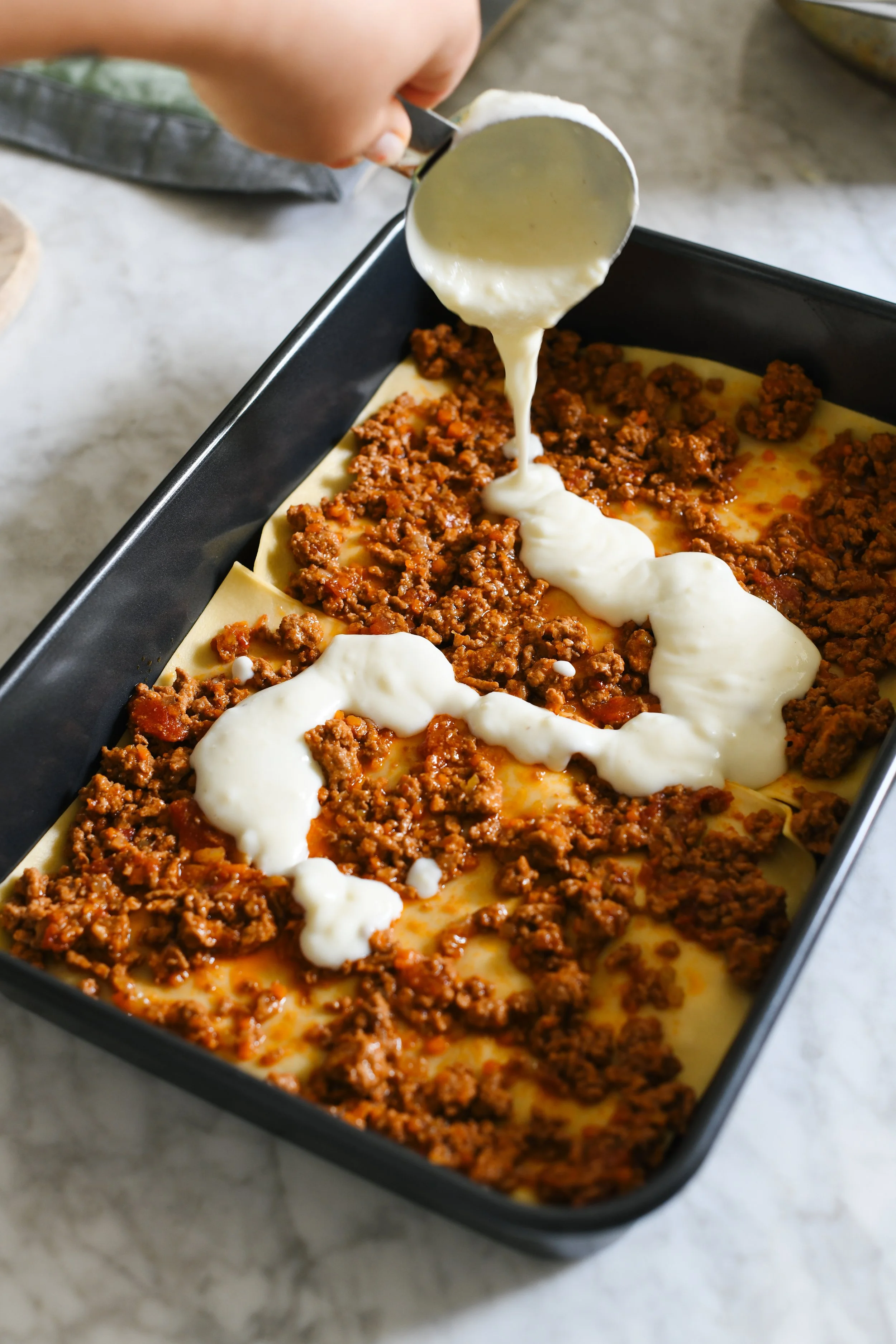 - Use what’s left of your ragu followed by a generous amount of besciamella (reserve some for this final layer!) – you want the pasta sheet fully covered. Cover with a whole heap of the cheeses.