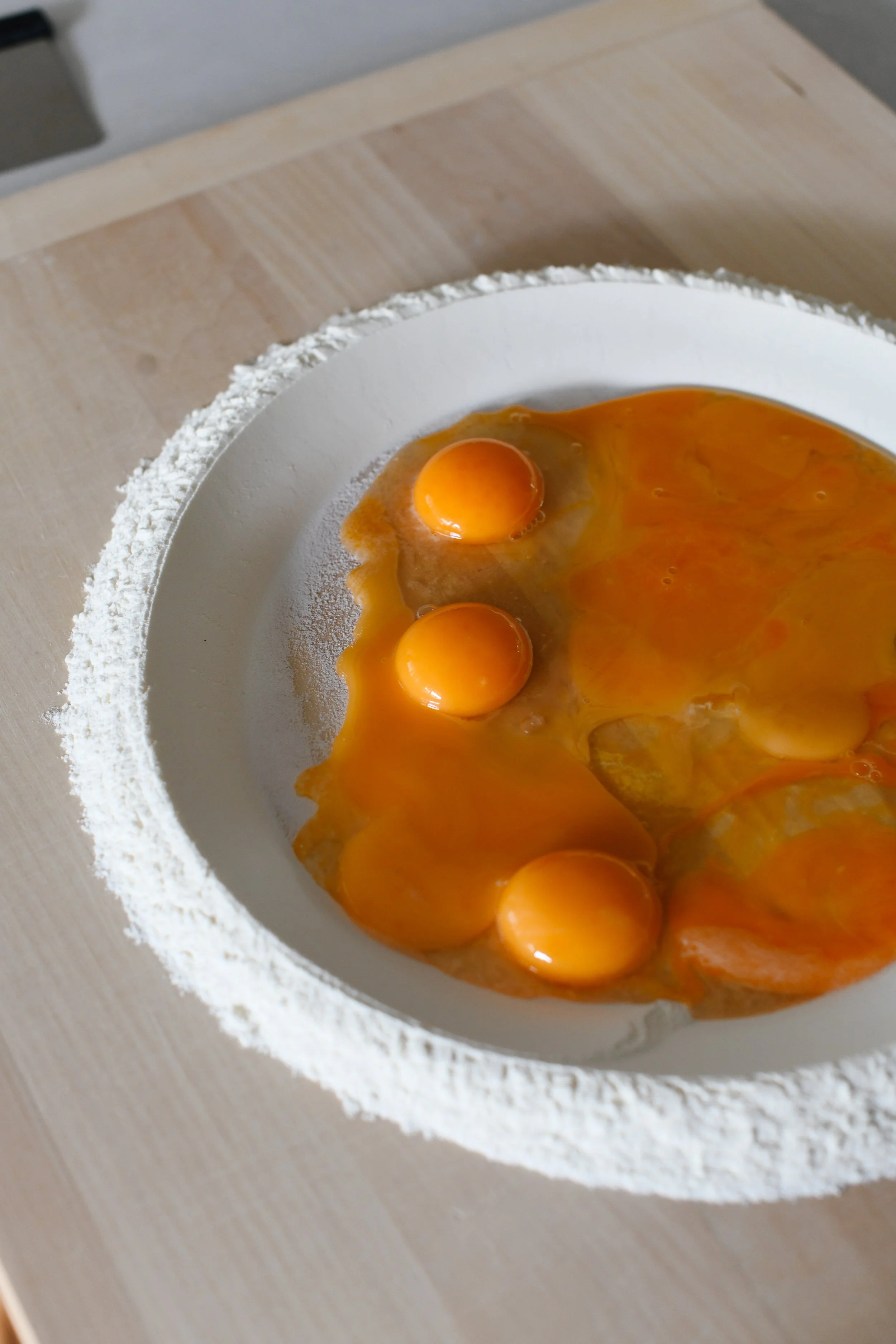 - Once rested, divide the dough into four pieces. Work with one at a time (keeping the rest covered to prevent them from drying out) – flatten the piece with your hand or a rolling pin before passing it through the thickest setting on your pasta machine. Fold the edges in to create a neat rectangle that fits the width of your pasta machine, and run it through the thickest setting again until your dough is uniform in shape