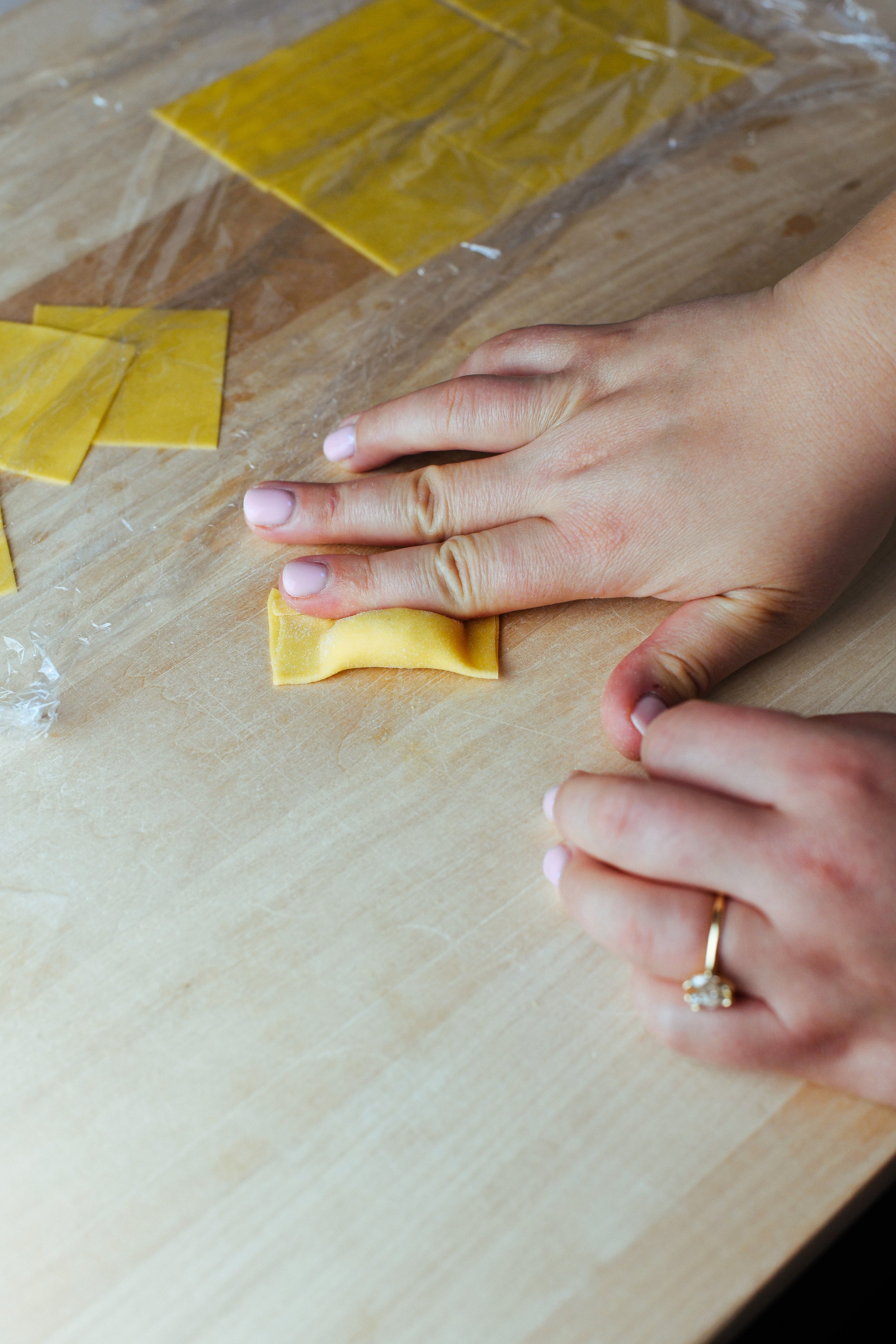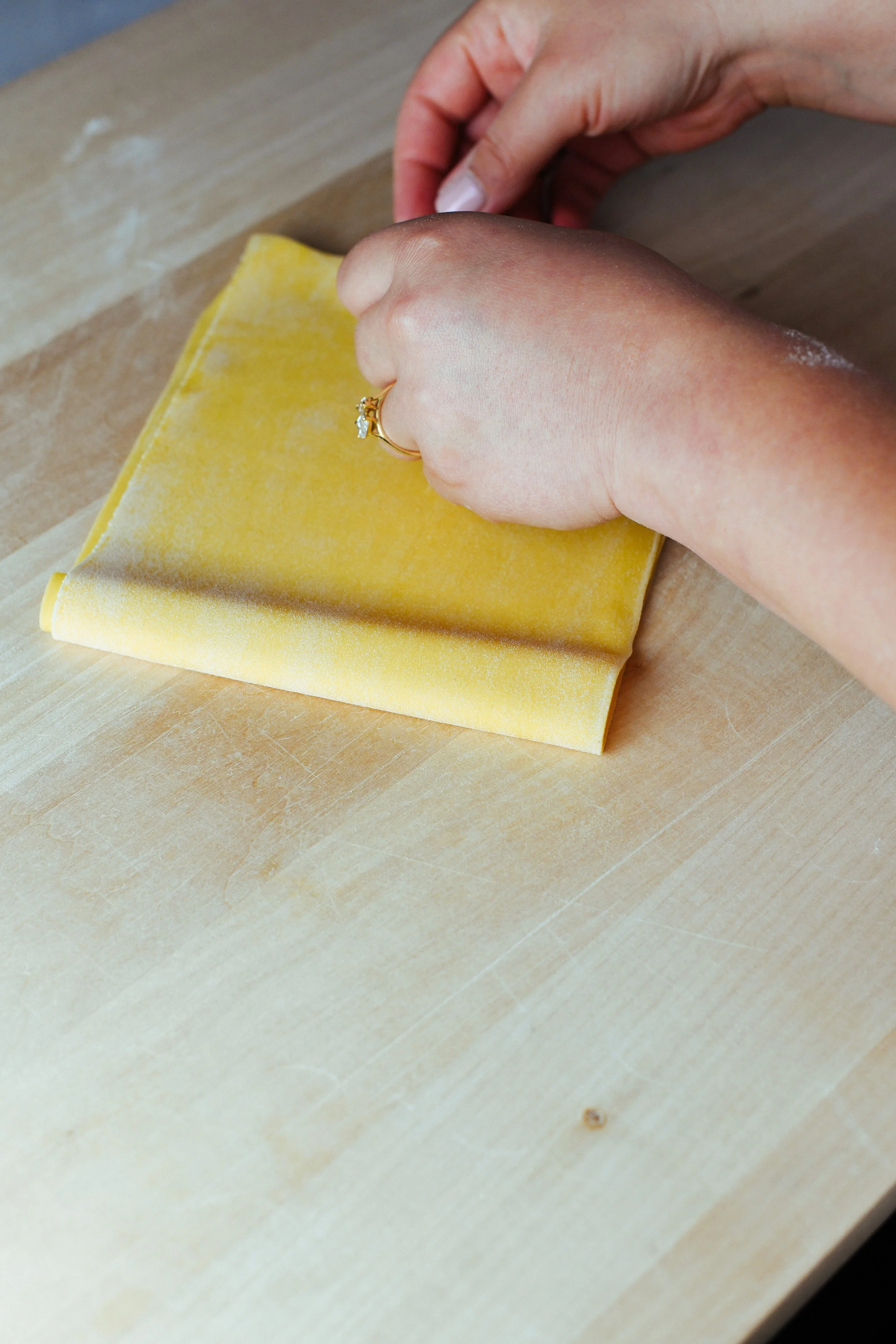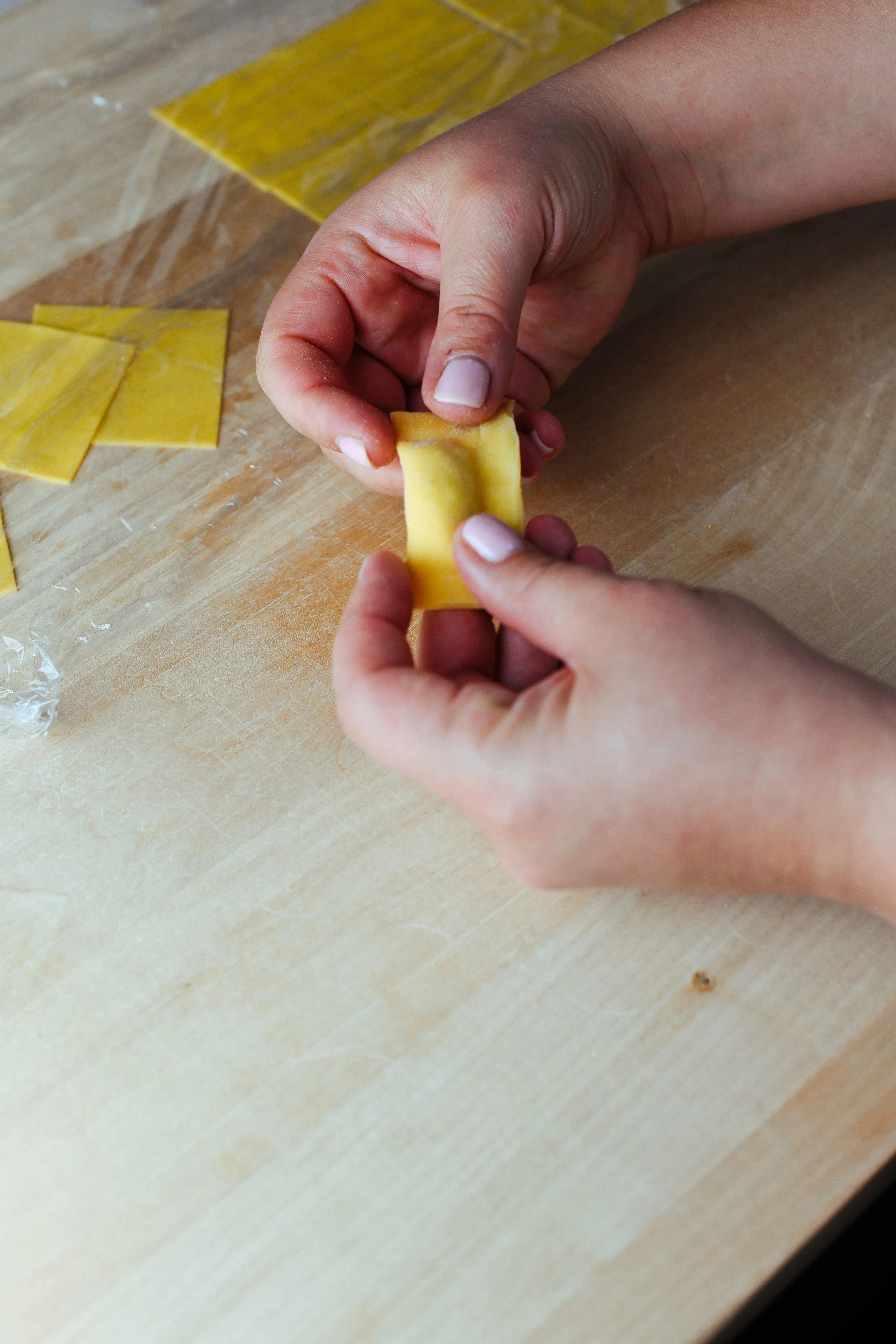 Cut the pasta sheet into two or three pieces so it’s easier to work with, then cut the sheet into 6x6cm squares. Roll the scraps back into a ball ready and keep covered with the rest of the unused dough