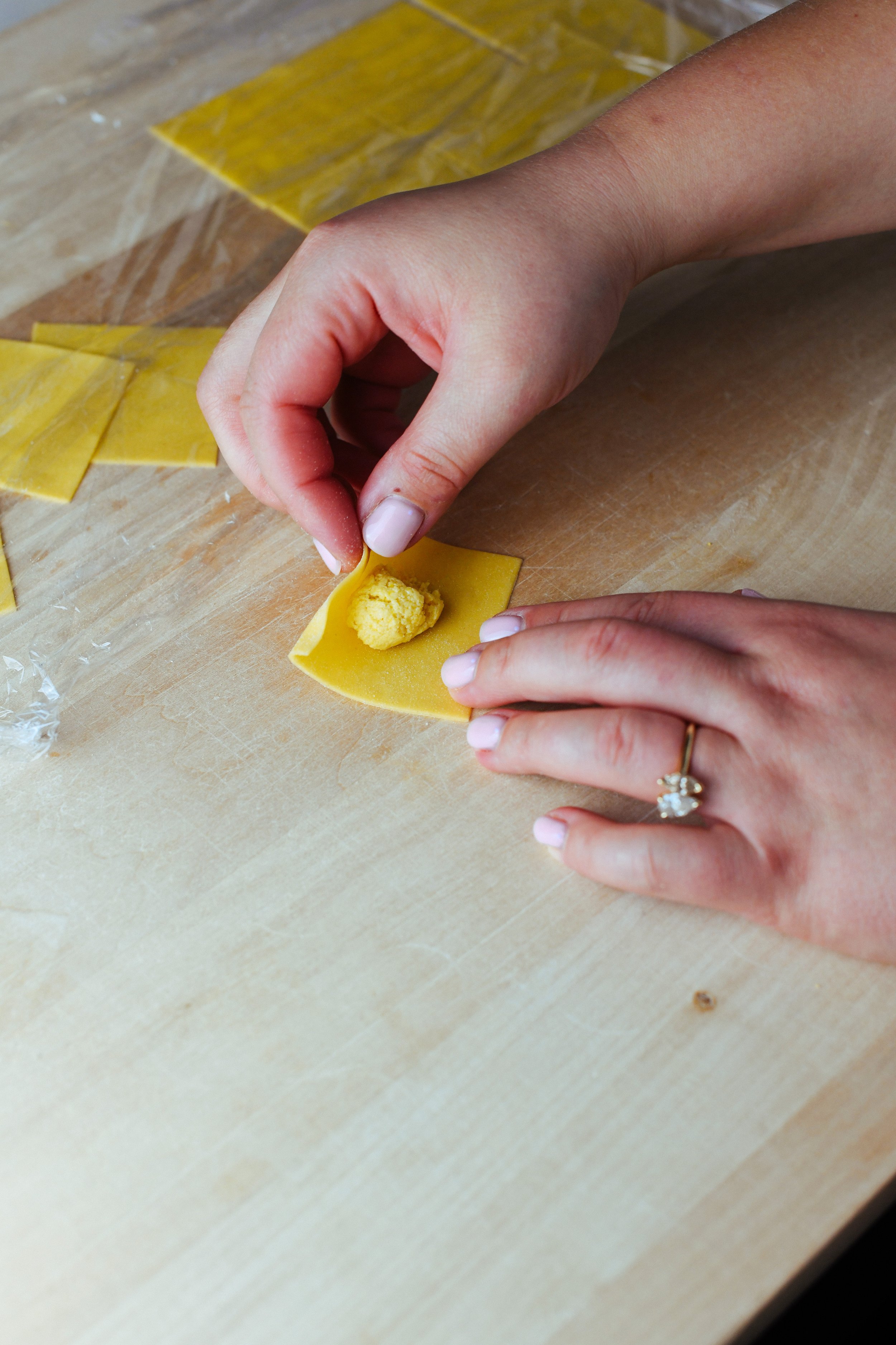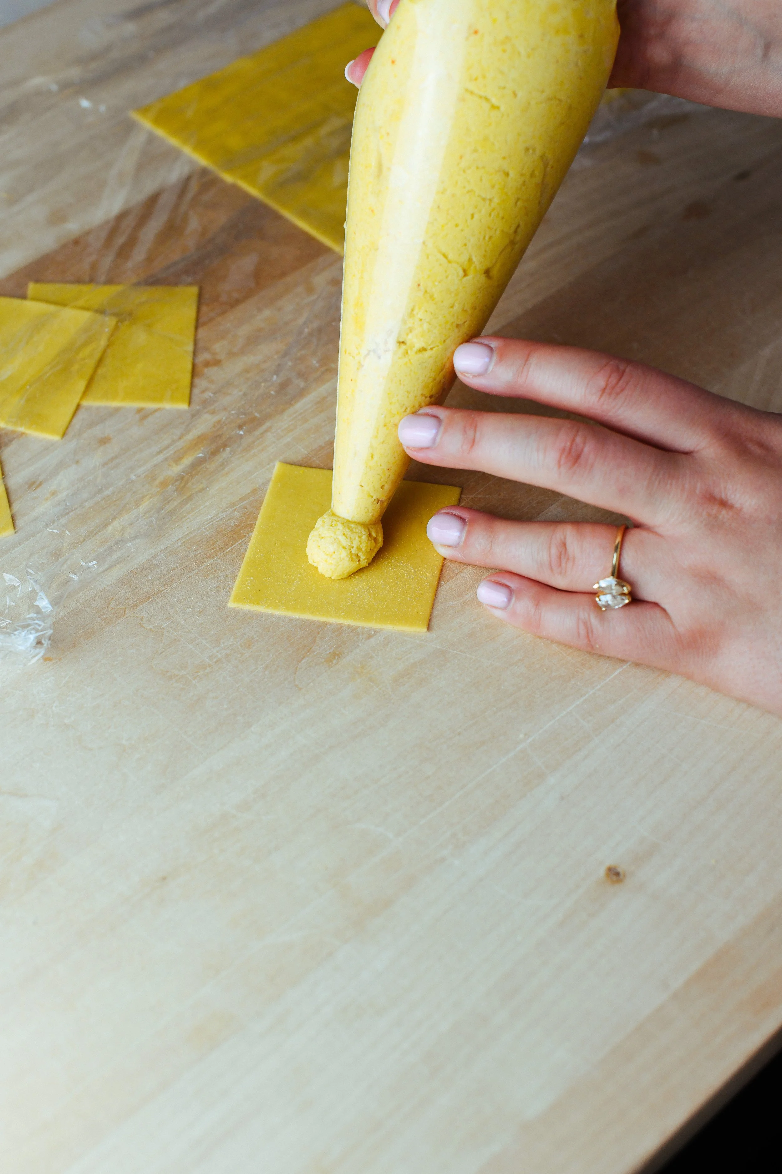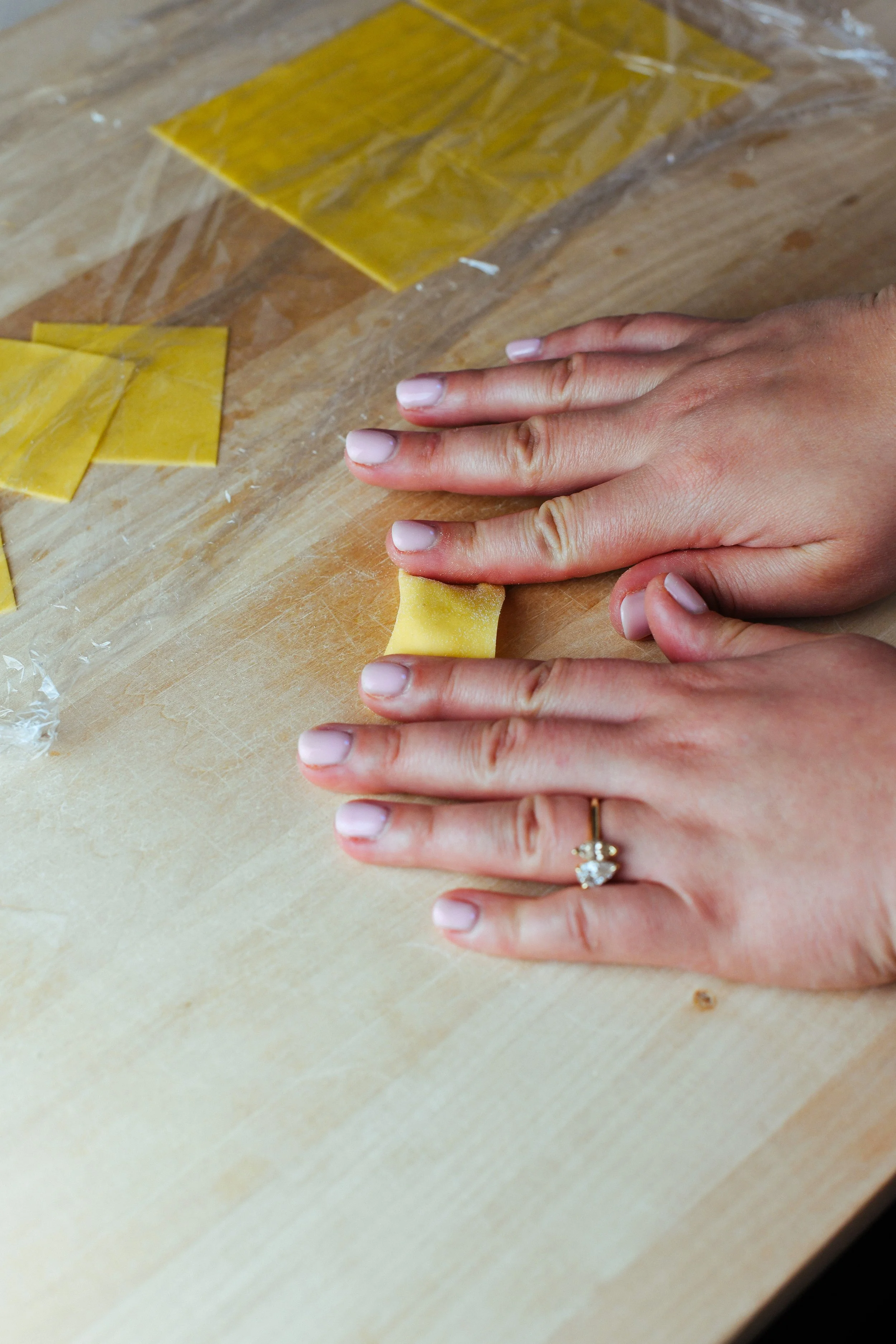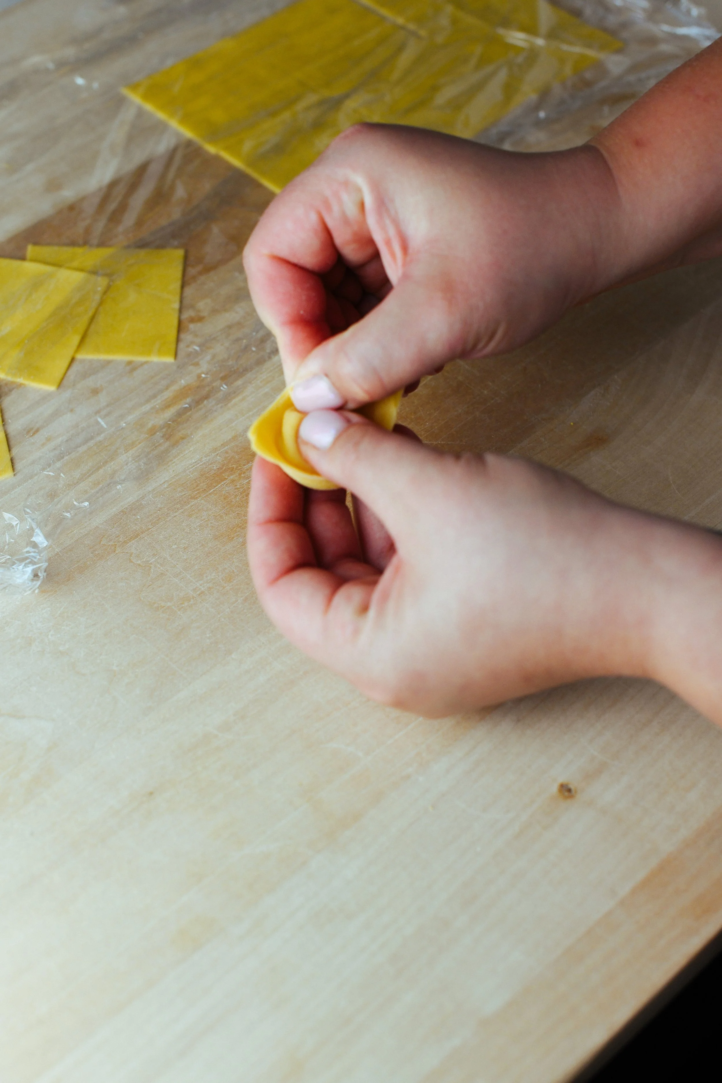 Cut the pasta sheet into two or three pieces so it’s easier to work with, then cut the sheet into 6x6cm squares. Roll the scraps back into a ball ready and keep covered with the rest of the unused dough