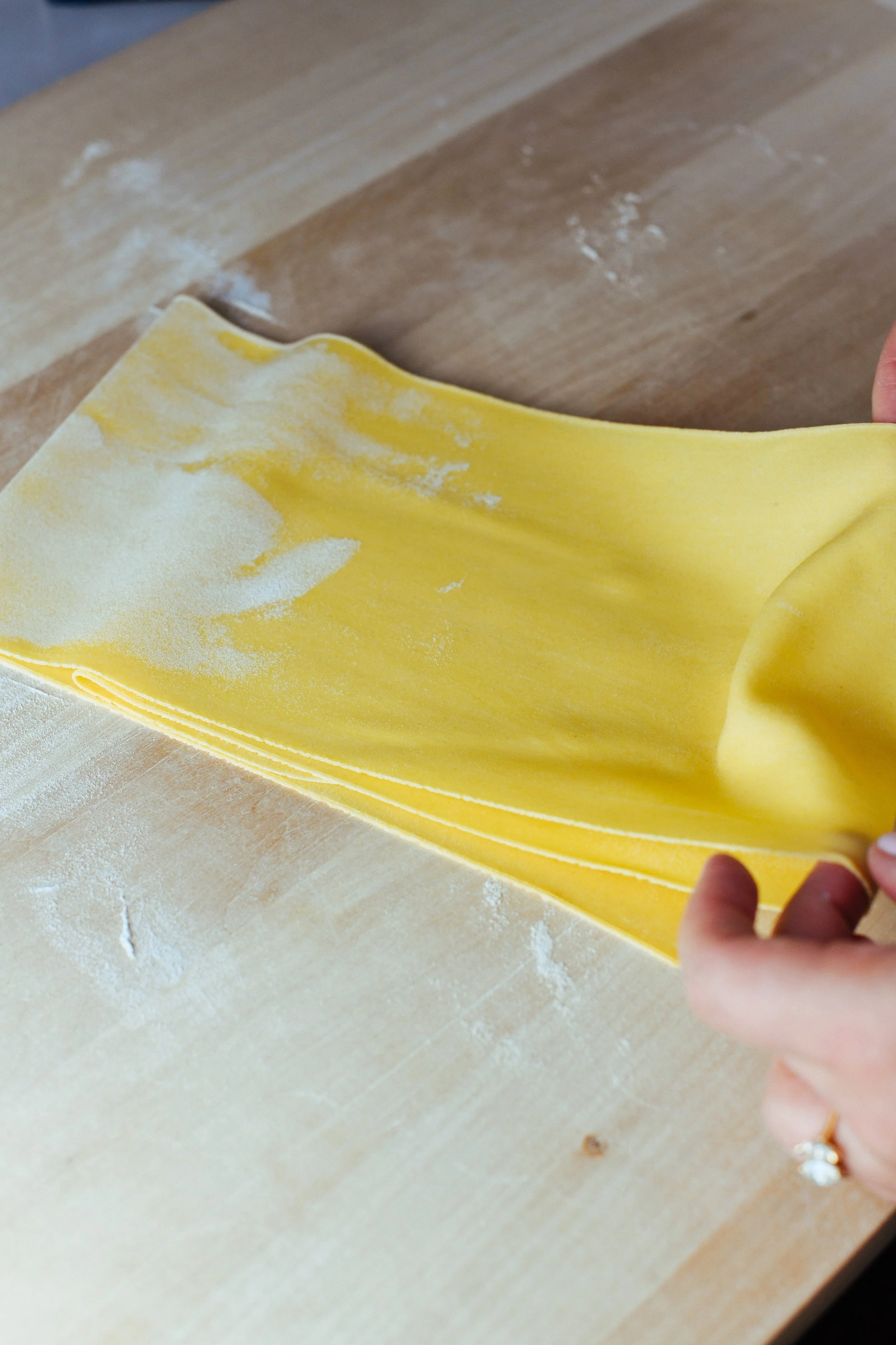 Divide the dough into four pieces. Work with one at a time – flatten the piece with your hand or a rolling pin before passing it through the thickest setting on your pasta machine. Fold the edges in to create a neat rectangle that fits the width of your pasta machine, and run it through the thickest setting again until your dough is uniform in shape