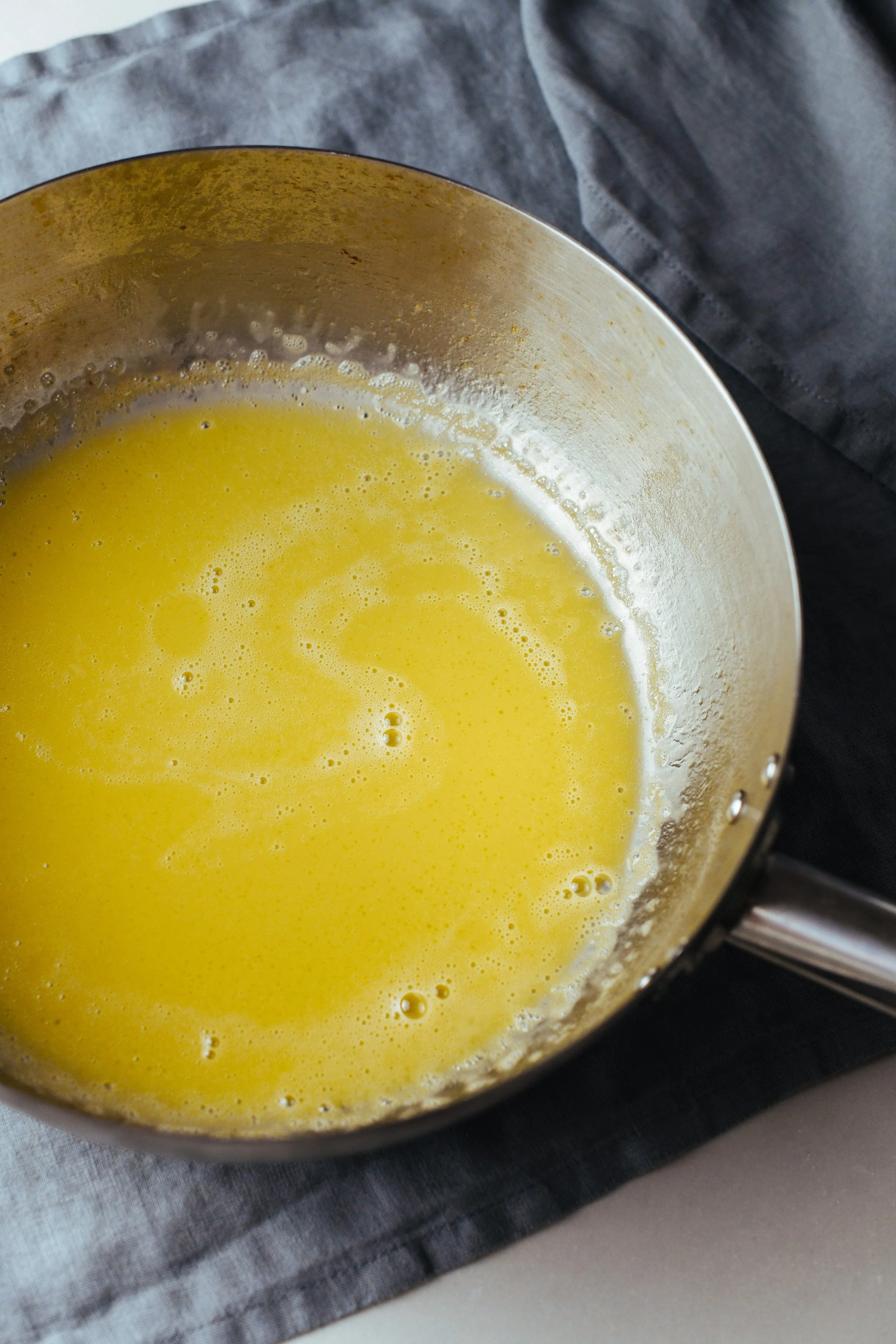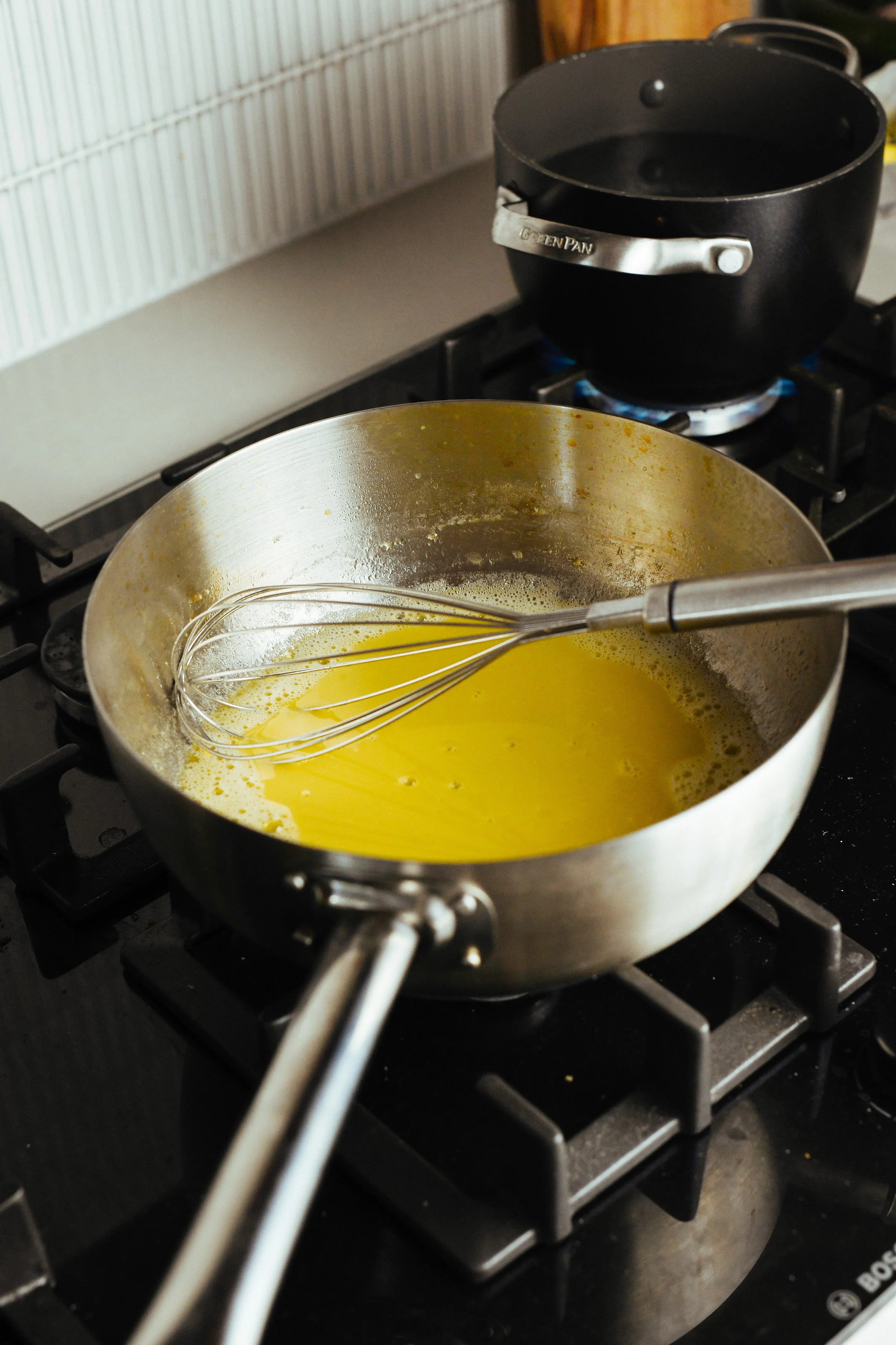 Once the stock is boiling, start to drop in a few cubes of cold butter, swirling the pan and whisking continuously until the butter is emulsified and uniform.