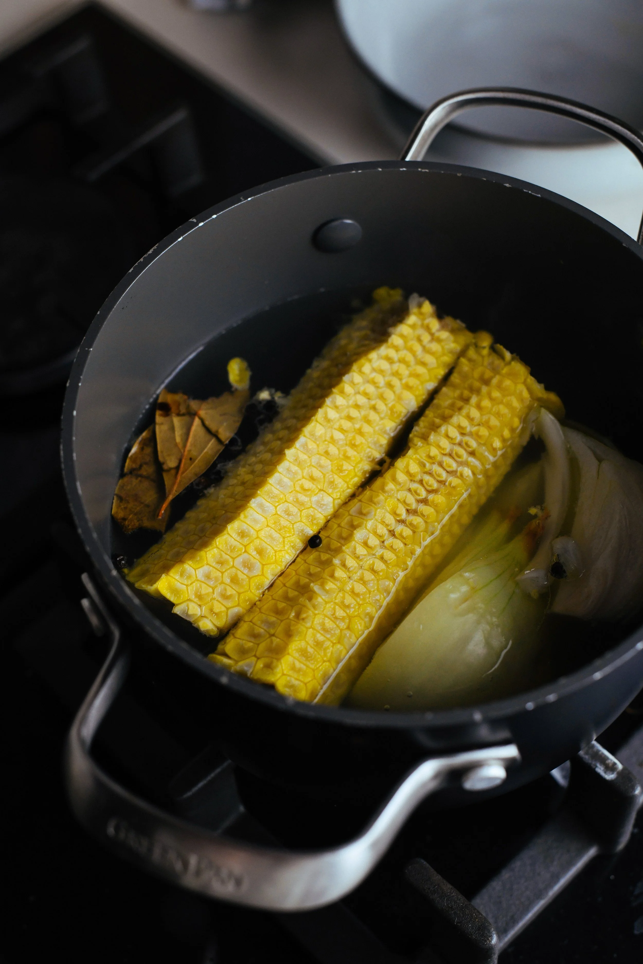 Place the corn cobs, bay leaves, onion and peppercorns in a pot and add just enough water to cover.