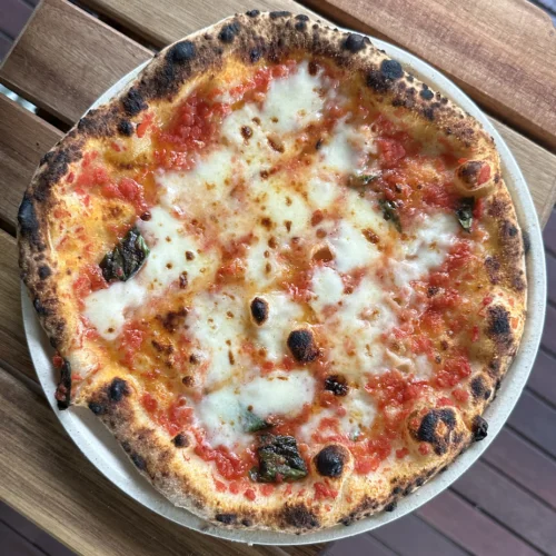 - Shape the pizza, top with your favourite delectables and cook at 375-400c/700-750f – allow the pizza (side closest to the flame) to puff up, colour/leopard slightly before your first rotation (around 20-30 seconds), then continue to rotate every 10-15 seconds in quarter turns until golden and bubbling.