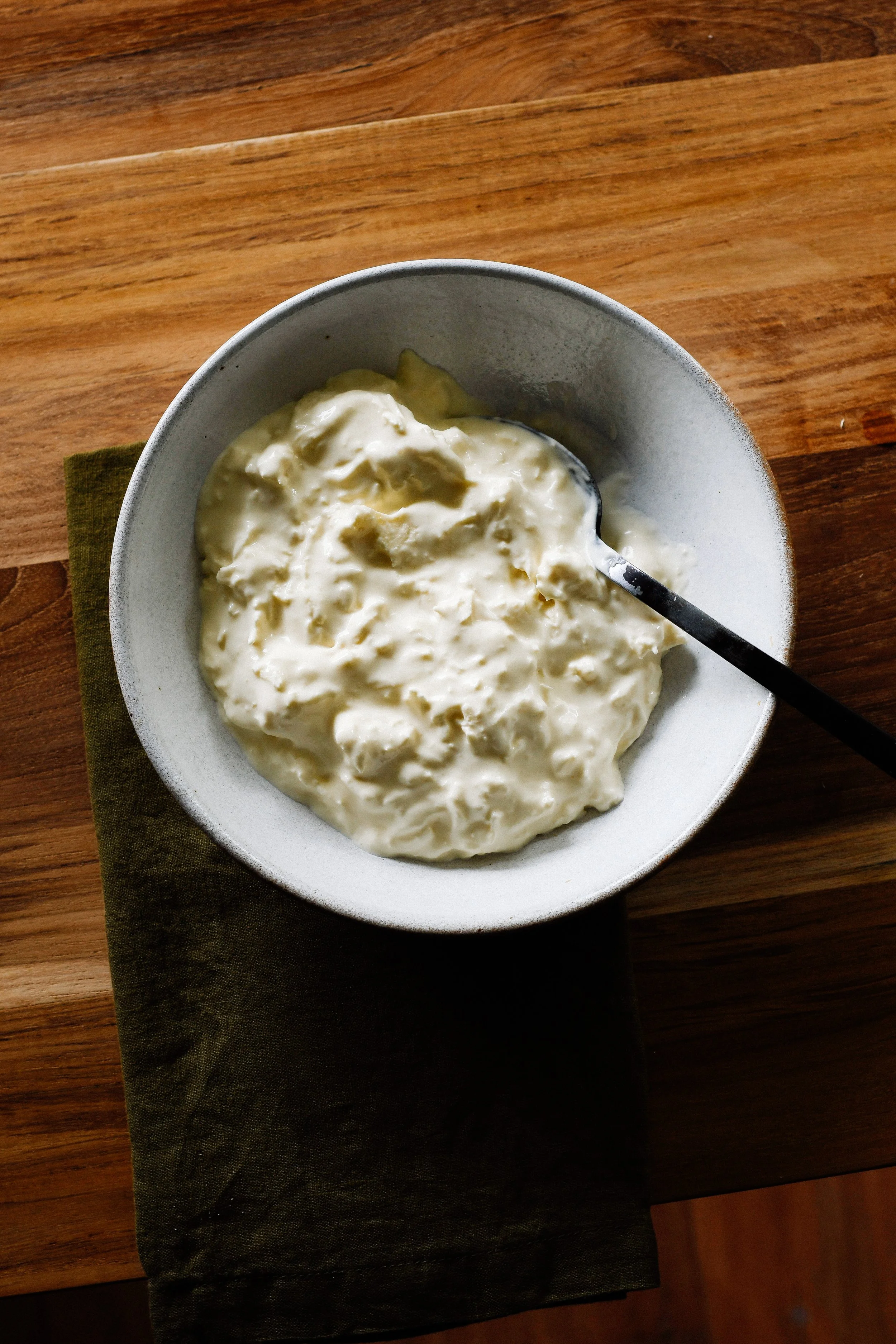Homemade stracciatella is a recent obsession of mine, mostly because it’s so easy to make. If you’re limited to a relatively average ball of mozza, this is a fantastic way to elevate it – simply by mixing in thickened/heavy cream and a pinch of salt. Something happens to the mozzarella when combined with cream and it is magic.