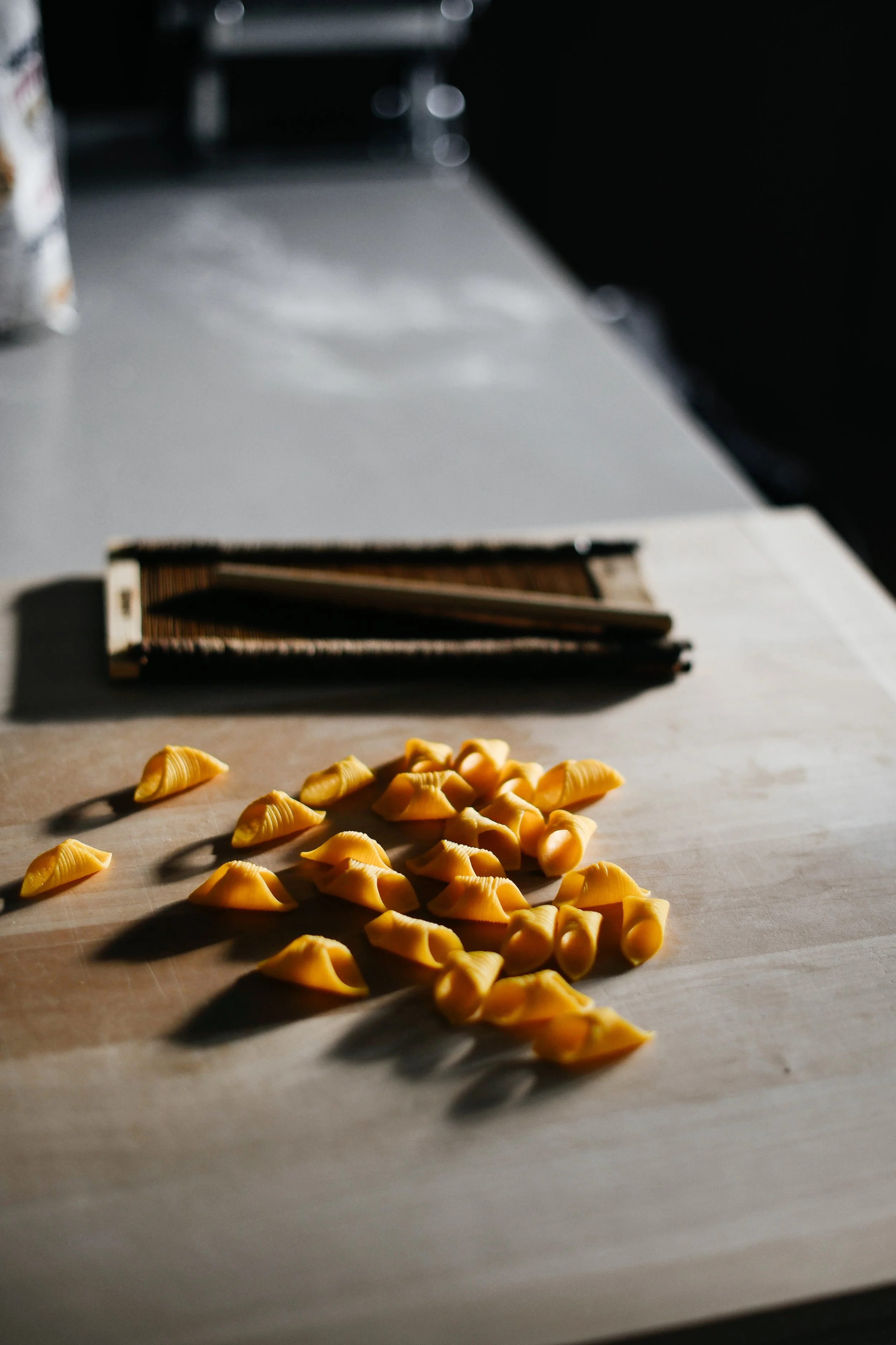 The name garganelli comes from the dialect word garganel, meaning chicken’s gullet – exactly what that beautiful ridged imprint on the pasta resembles. Typically these ridges are made with a tool called a pettine, however you can quite easily use a gnocchi board in place. Or you could make this shape without any tool at all and keep it smooth (scifuloti).