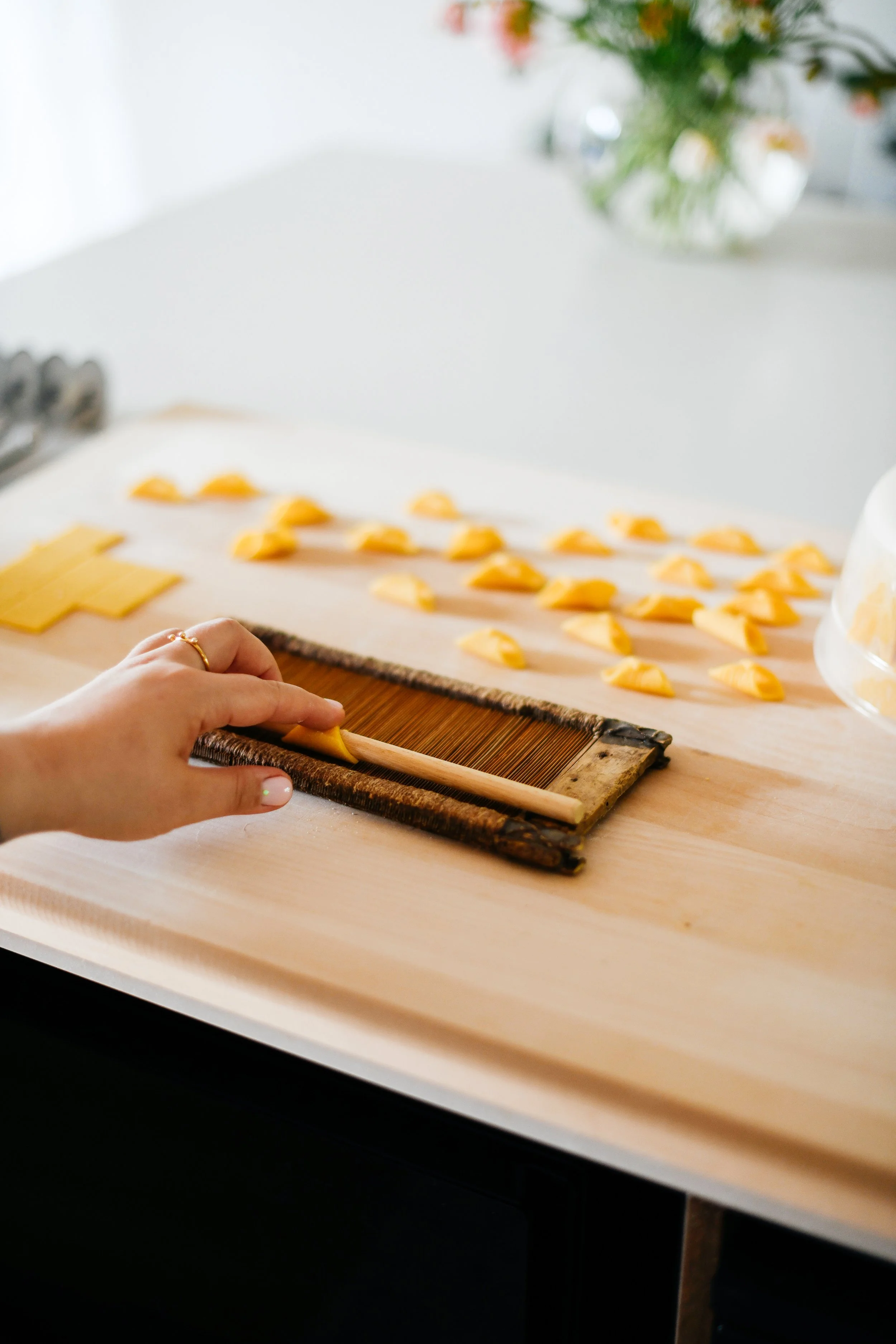 5. Gently slide the garganelli off the dowel and set aside on a baking sheet lined with fine semolina.