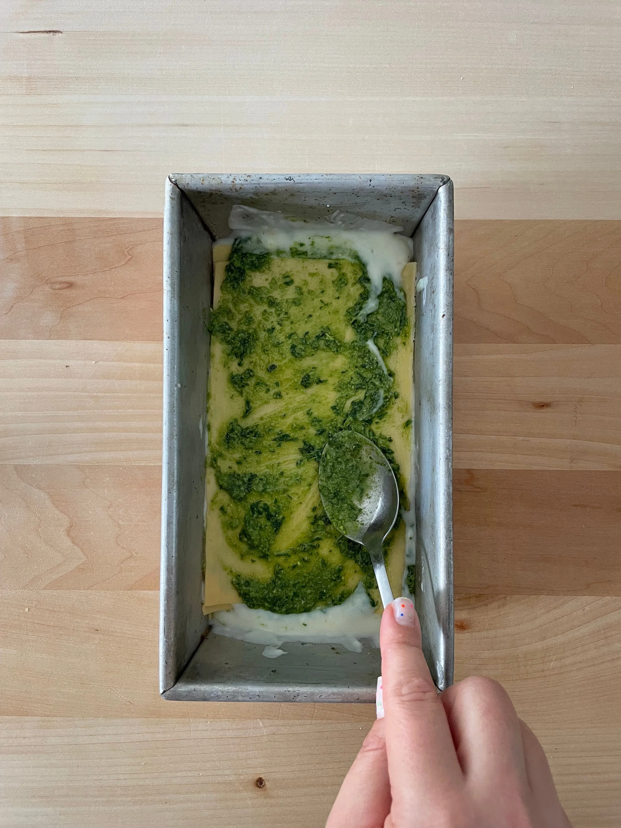 start with a dollop of besciamella on the base of your loaf tin followed by a sheet of pasta.