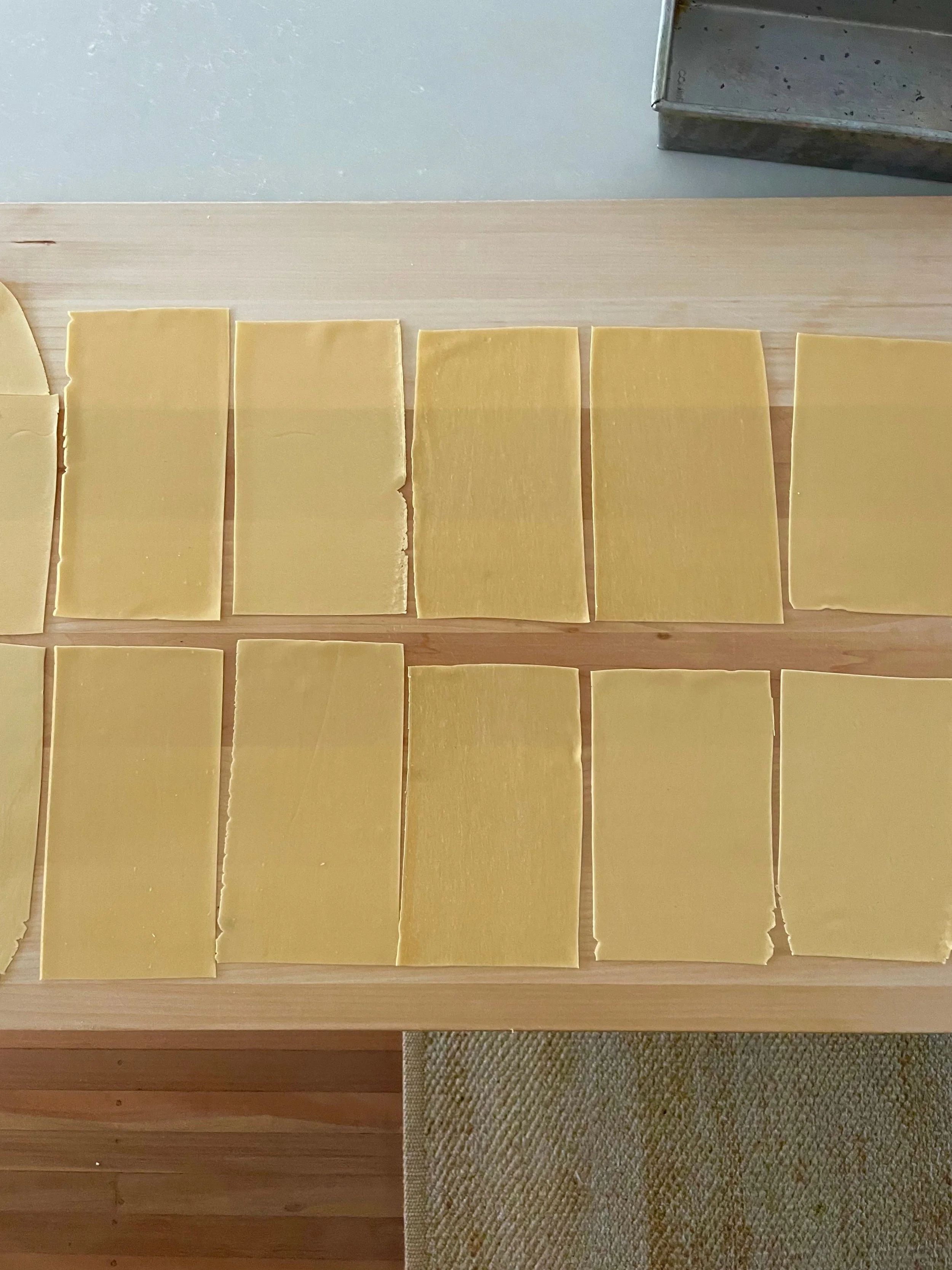 Re-roll any scraps to avoid wastage, and set your cut lasagne sheets aside, covered with a clean tea towel.