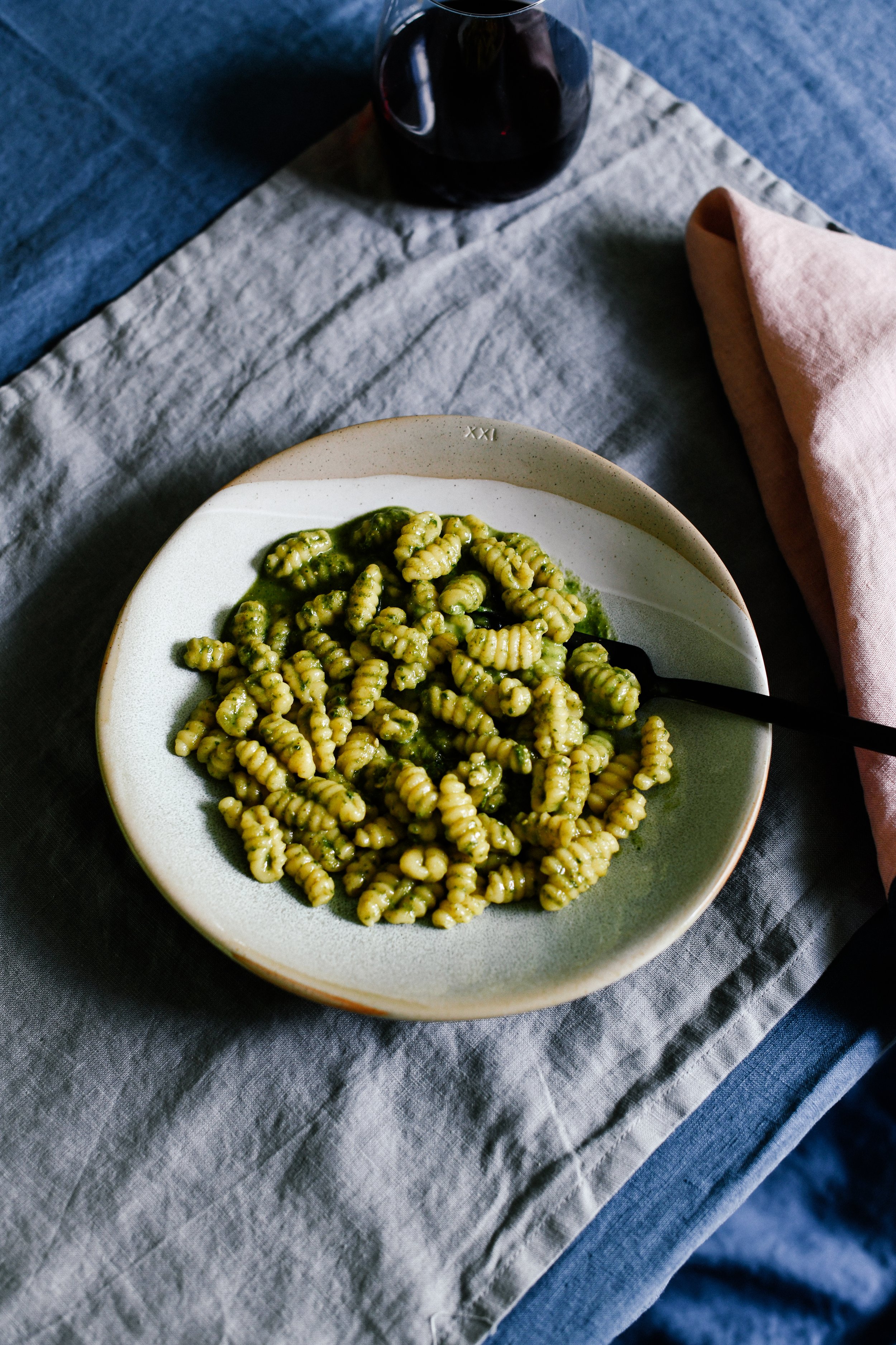 Reserve a 1/2 cup of the pasta water. Add the pesto to a large bowl (if you have a metal mixing bowl even better, as it retains the heat nicely), followed by the drained malloreddus pasta.