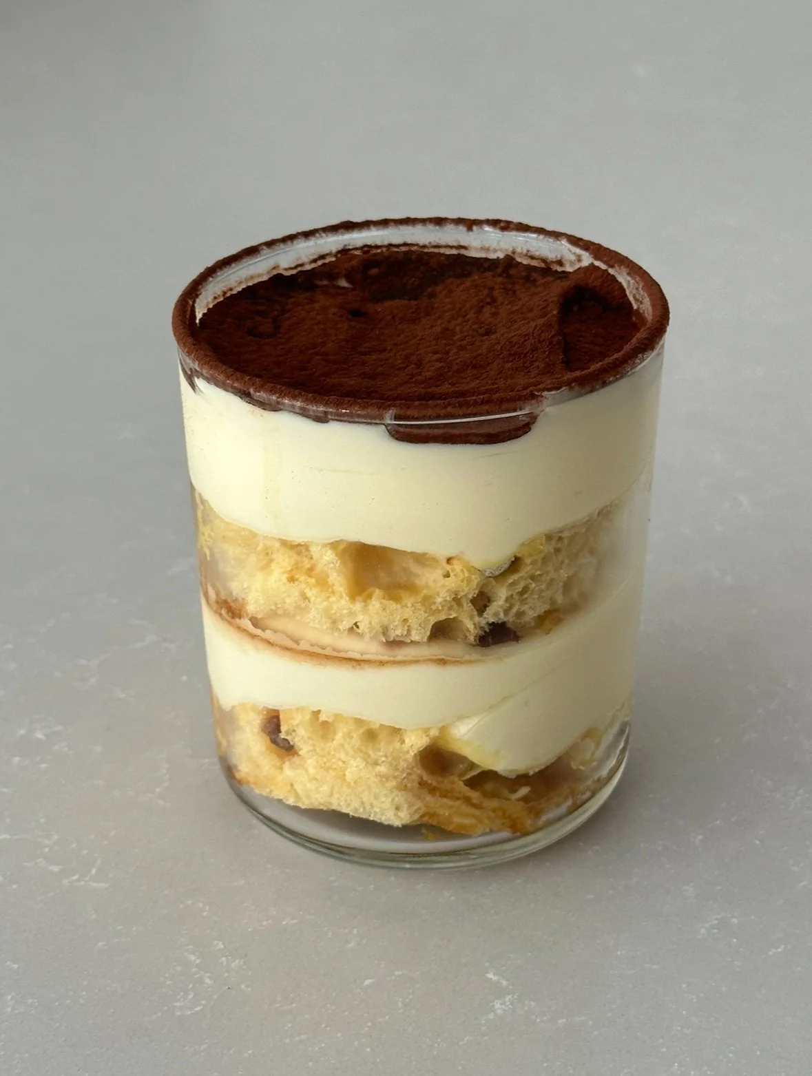 - Start by placing a round of panettone at the bottom of your chosen vessel. Drizzle over 1-2 tbsp coffee (it’s important not to soak the panettone like you would a savoiardi, because it will basically disintegrate – trust me, I failed so you don’t have to!).