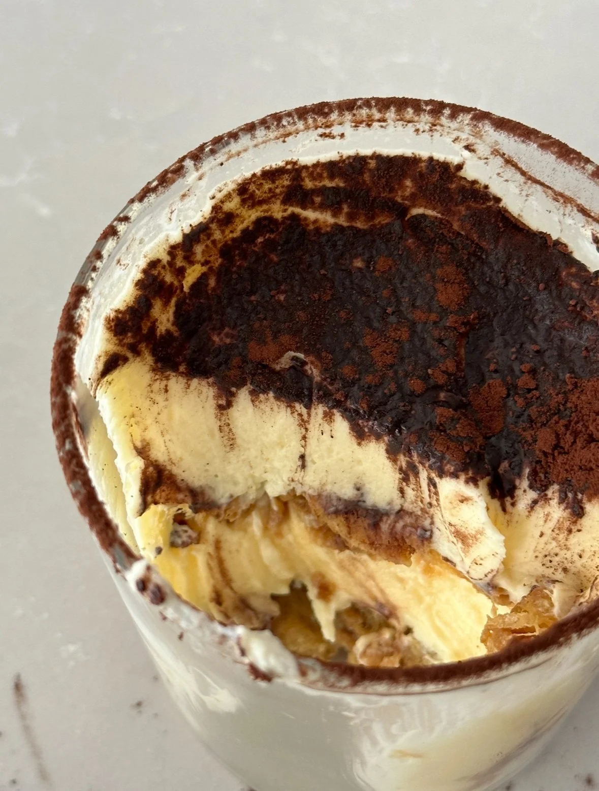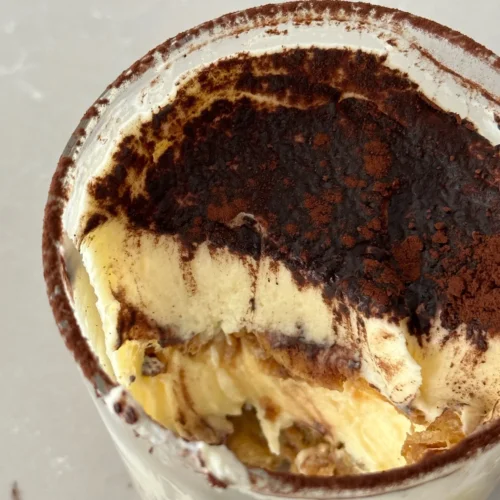 - Finish with a dusting of cocoa and importantly – refrigerate for at least a couple of hours before serving.