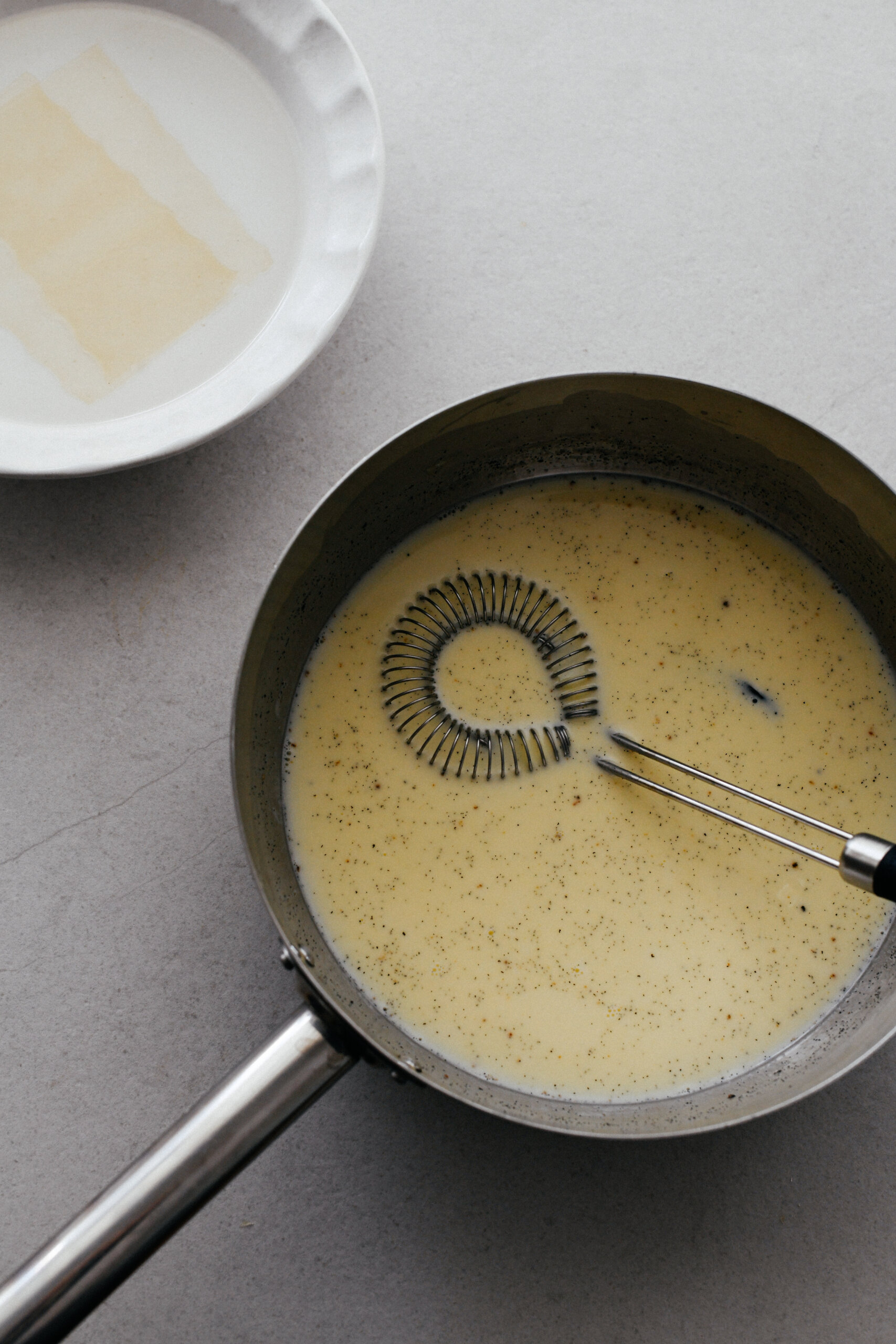 - Heat milk, cream and vanilla until just starting to boil – turn off the heat, cover and let it steep for 5 min.