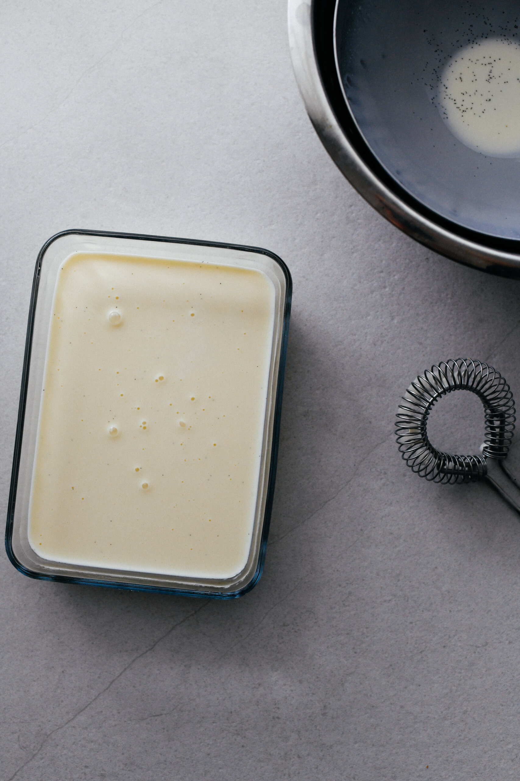 - An optional step is to strain the liquid into a bowl set over a larger bowl filled with iced water, stirring frequently over 15 minutes until it cools and thickens slightly. This should help prevent the vanilla from sinking to the bottom.