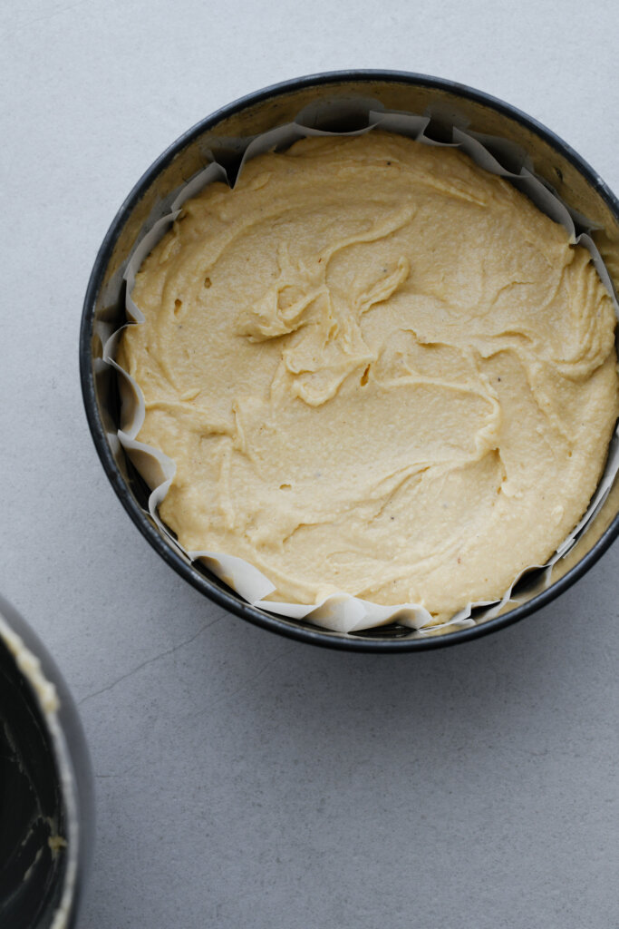 - Pour the cake mixture into your prepared tin and set aside briefly while you make the topping.