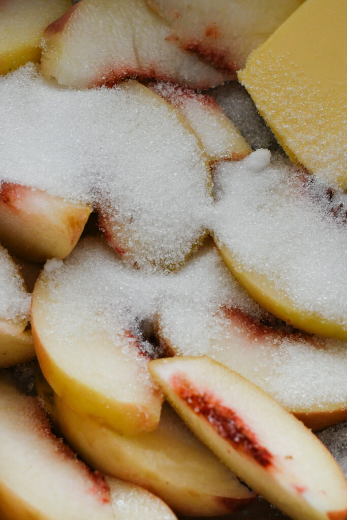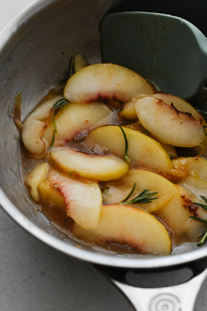 - Add the peach slices, butter, sugar and rosemary to a small pan and cook over a medium heat, moving the peaches around in the pan frequently. The butter and sugar will melt together and it will all smell a bit lovely – you really just want the peach to start to soften slightly, and break down a little so their juices sort of emulsify with the butter.