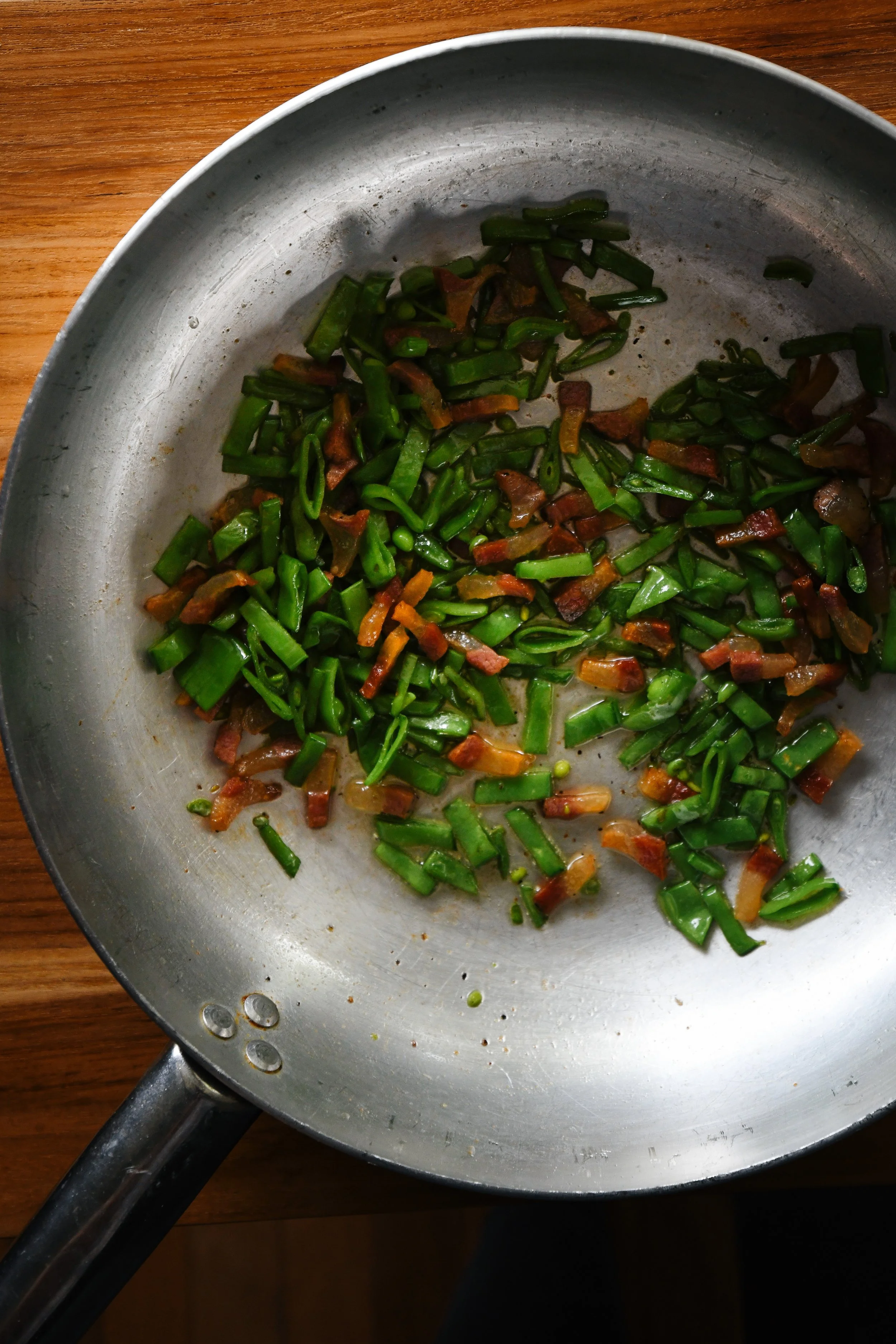 - Once the guanciale starts to crisp up, add the sliced snap peas and sauté for a few minutes.