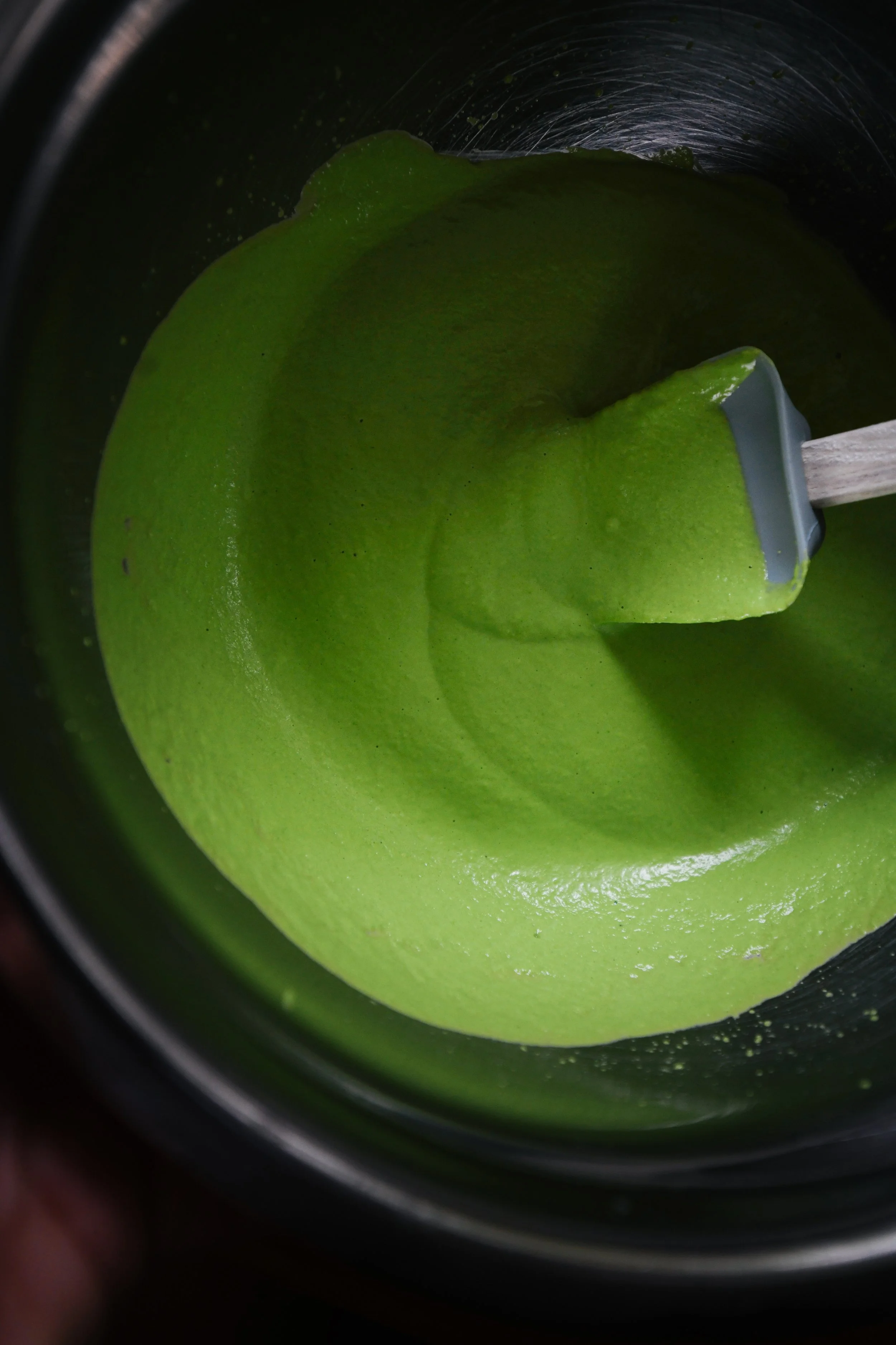 - Add the pea sauce, a generous amount of pasta cooking water and toss to marry.