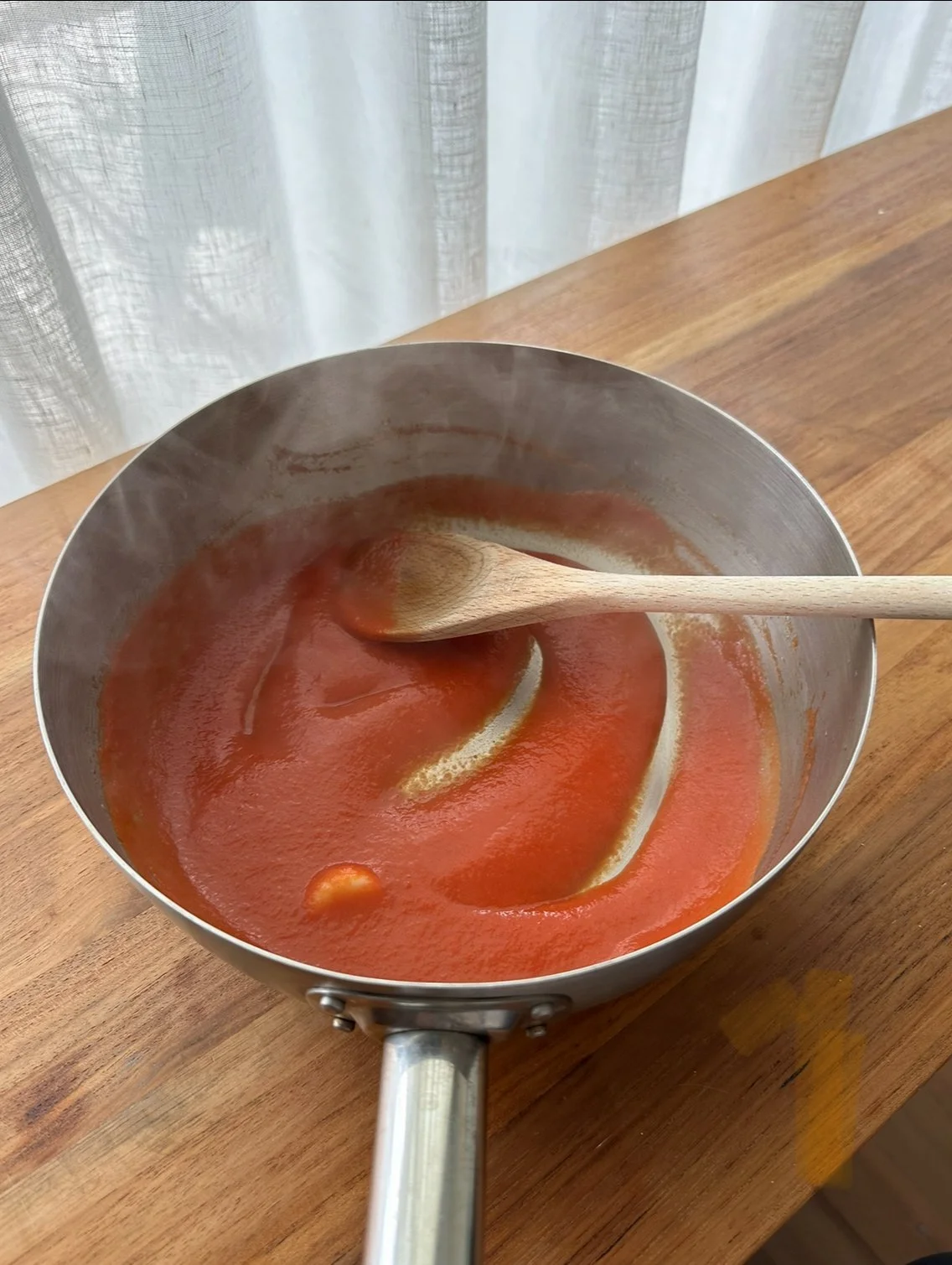My recipe is a little different in that it uses passata, garlic and butter – it’s quicker to make as you’re not working with whole tomatoes, and it has a very slight hum of garlic to it, which I really love.