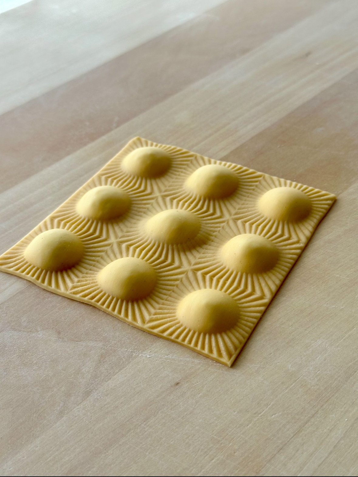 - Flip the mould over to remove the pasta, then using a tagliapasta or pastry butter, separate the ravioli – you can also keep the sheet whole like I have here, just for fun!