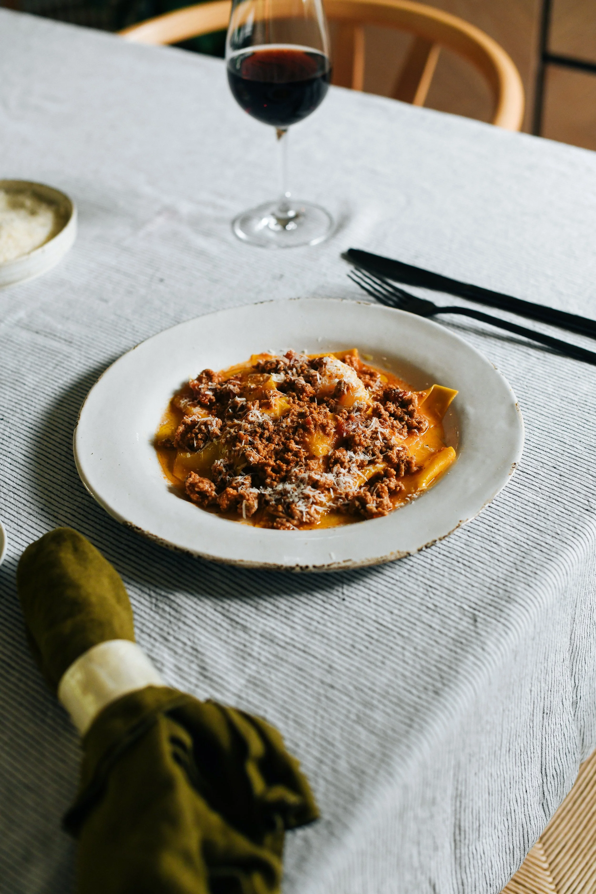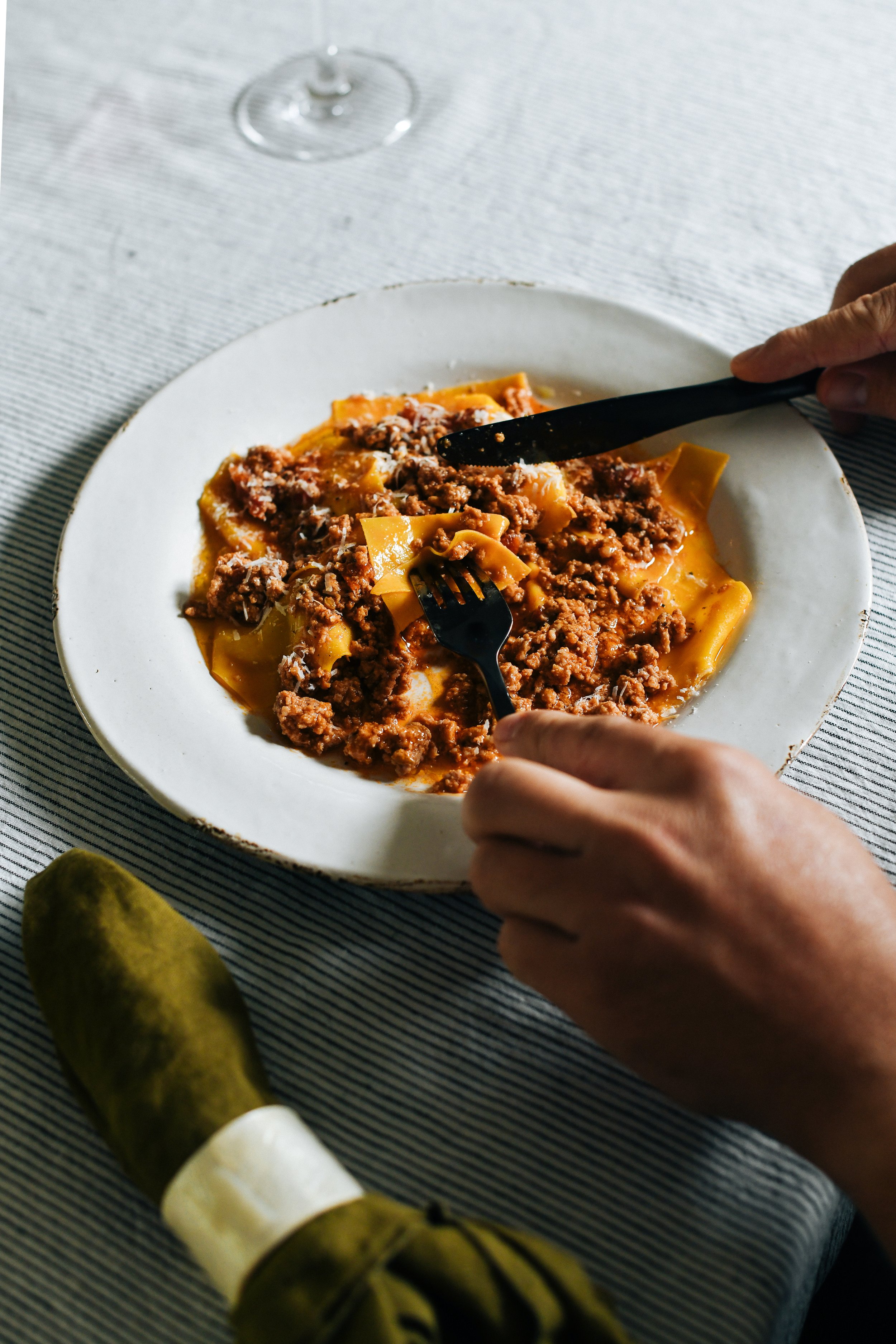 Ragu – the ultimate Sunday Sauce, am I right? This is a low maintenance sauce that requires about 20 minutes of your time up front, followed by a long and lazy cook. Let this bubble away on your stove top for a few hours (or longer if you have the time and patience), then toss it through your favourite pasta or as this recipe suggests, Silk Handkerchiefs – a beautifully thin and absolutely luxurious pasta hailing from Liguria. Once you try this shape I promise you will not look back.