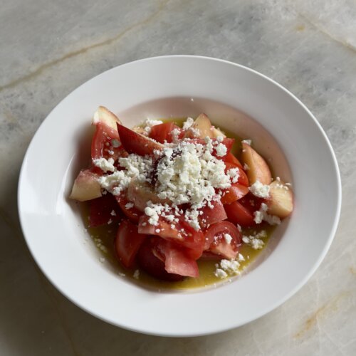 Feta makes for the perfect adornment – a nod to the age-old watermelon and feta pairing – the saltiness of the feta with the sweetness of the nectarine and tomato is a combination that will never get old.