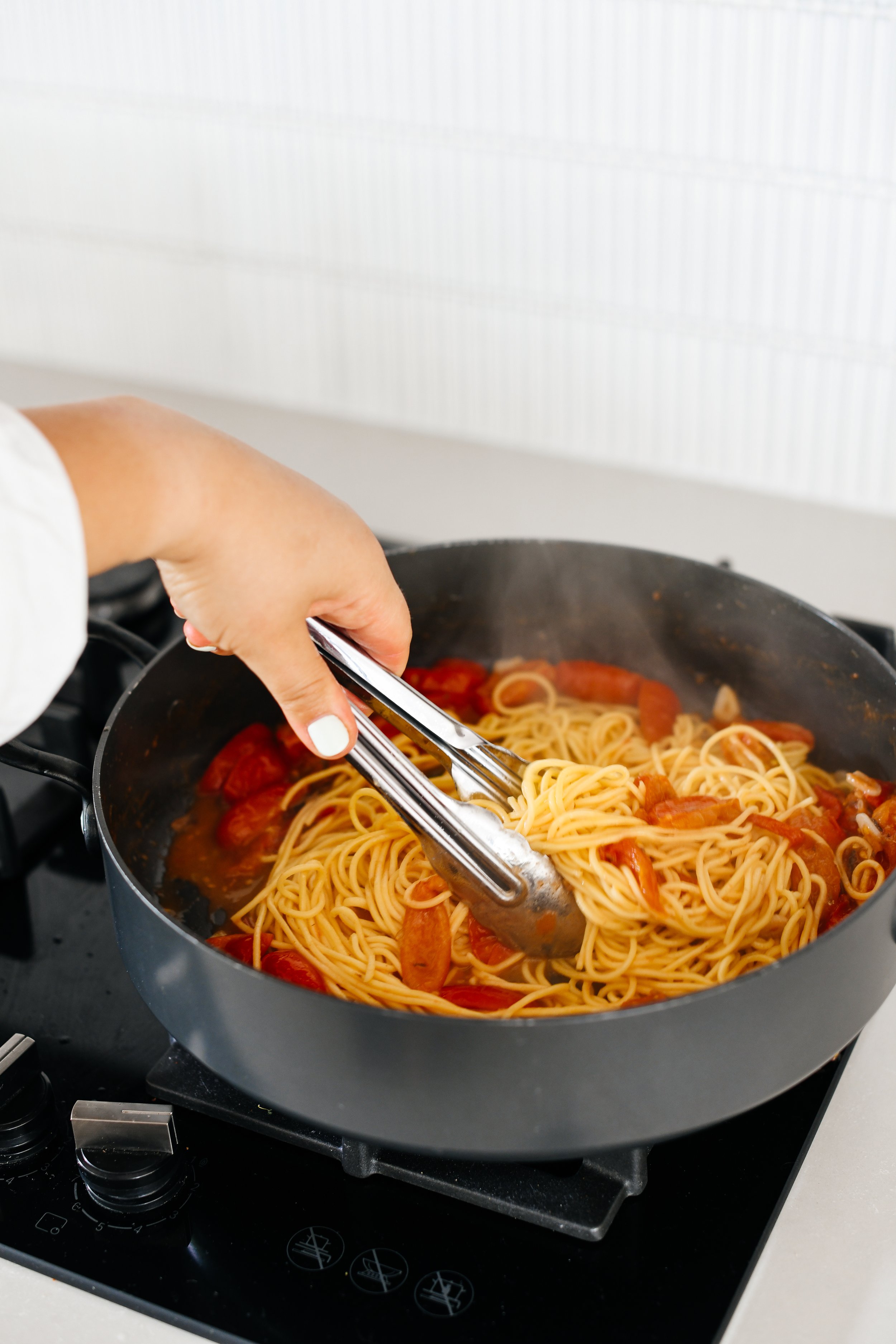 5. Drop the tonnarelli directly into the sauce, taking with it generous splashes of salty, starchy pasta water and toss until the pasta is evenly coated with the sauce.