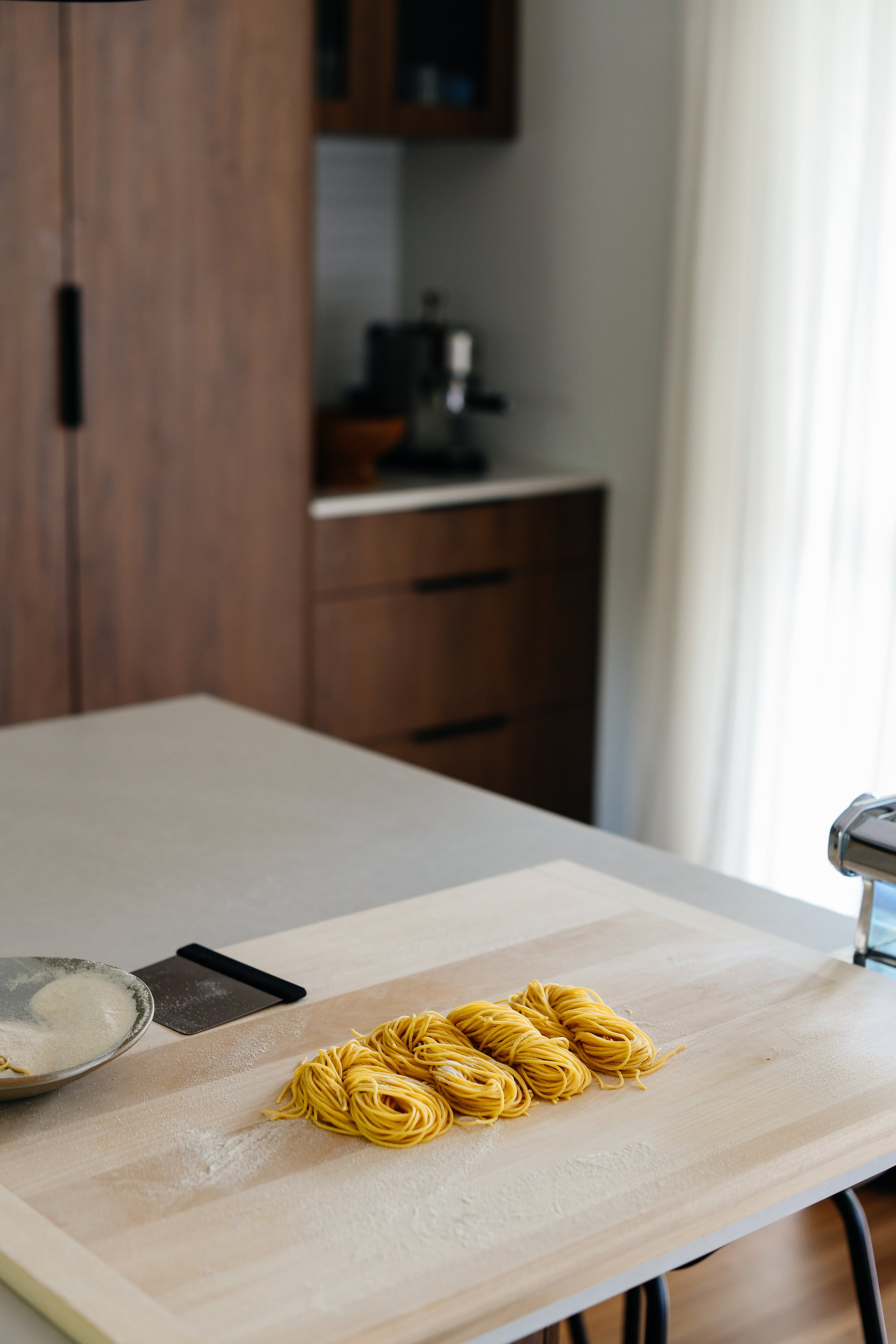 6. Pass the rolled dough through a tagliolini attachment to create your tonnarelli. Continue with the remaining dough.