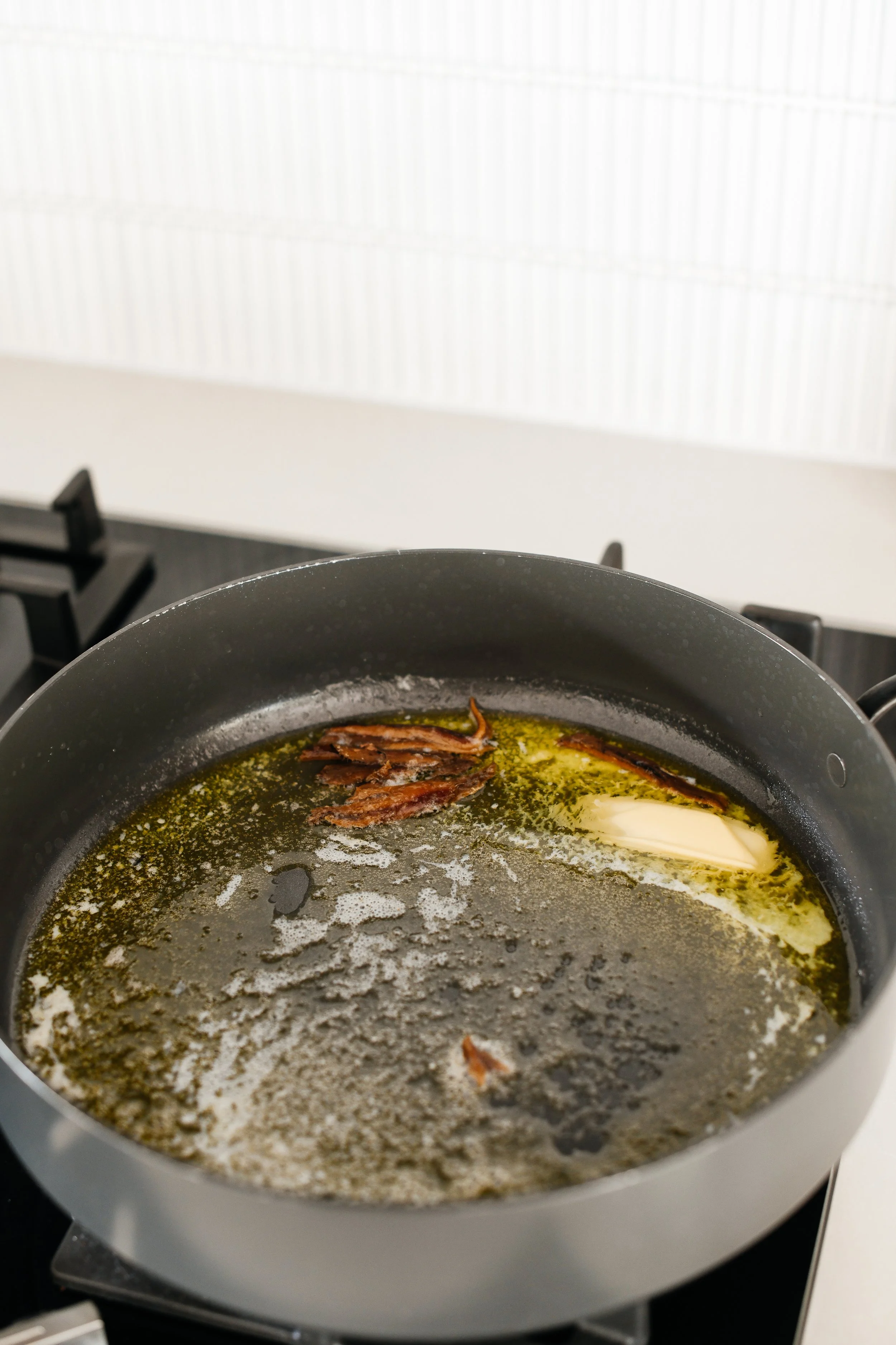 2. Throw in the anchovy fillets and cook gently until they start breaking down. The butter will start to brown and smell wonderfully nutty.