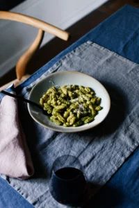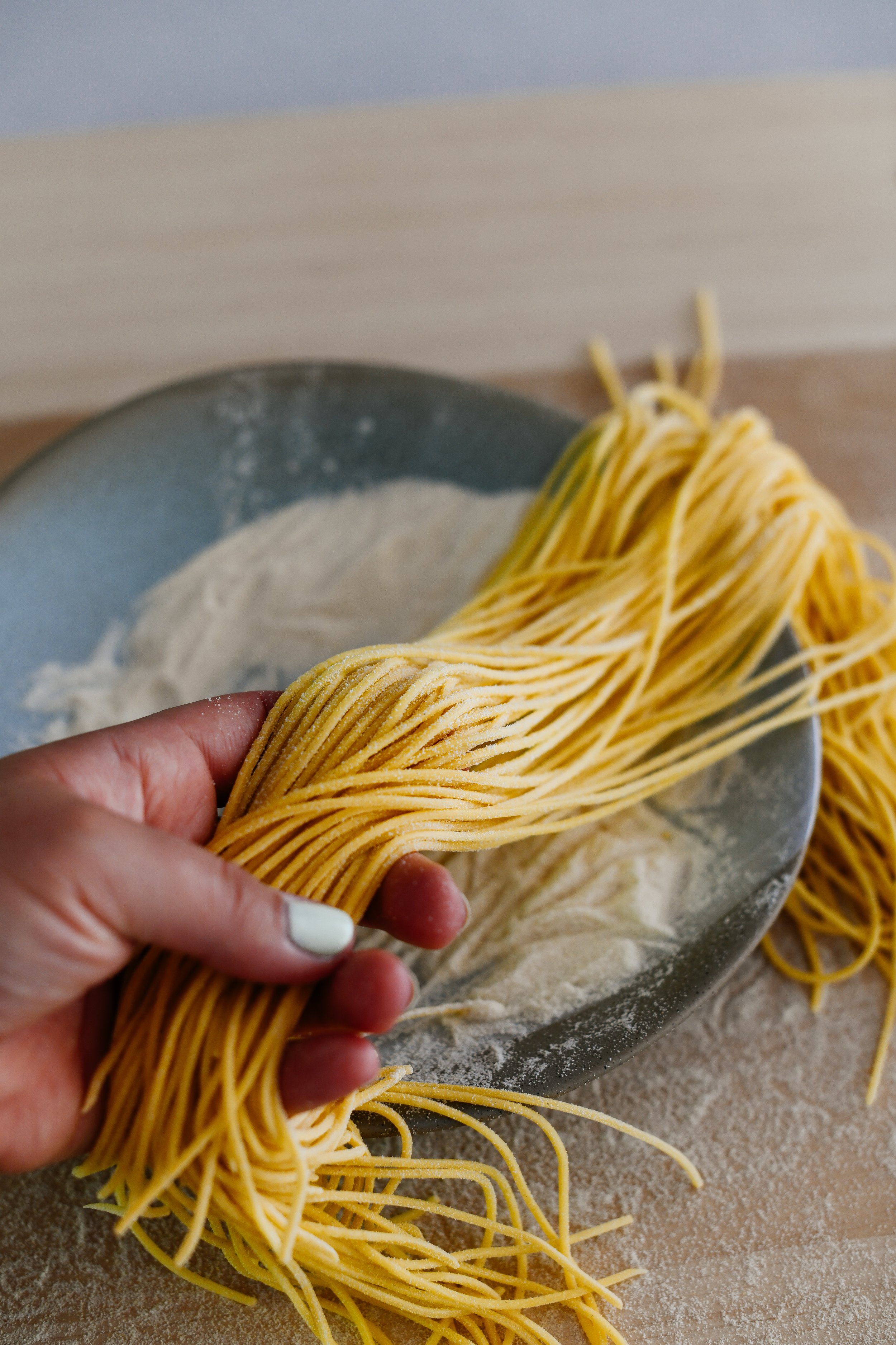 This sauce works with any shape, but I love pairing it with a long spaghetti type pasta. Tonnarelli is a spaghetti-like egg pasta with square edges, often called spaghetti alla chitarra, due to the special tool used to cut it which resembles a guitar. This recipe doesn’t require a chitarra, but rather utilises a more common pasta cutter found with most pasta machines. Simply roll the dough much thicker than you would usually and pass it through a tagliolini cutter to achieve a squared spaghetti shape.